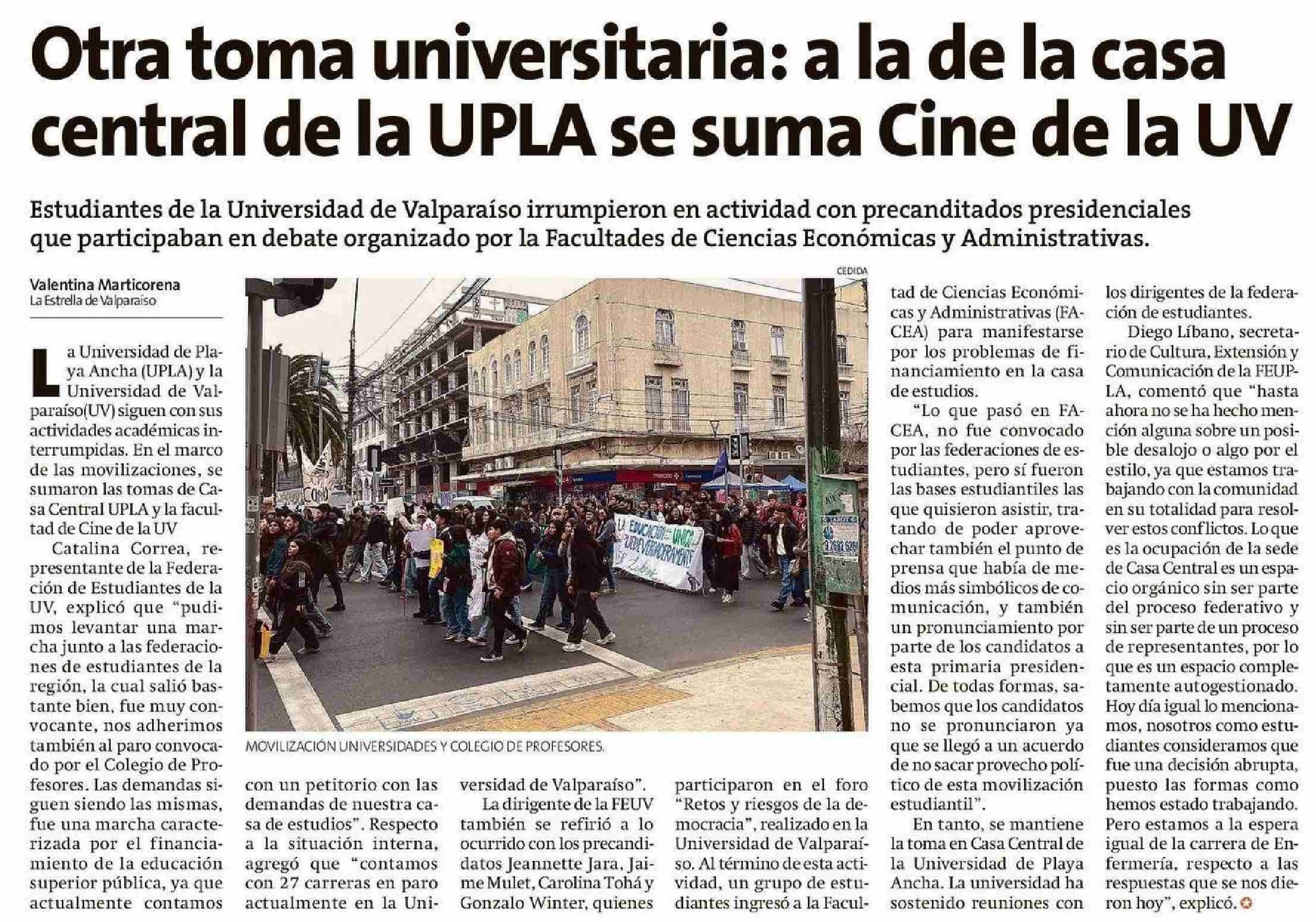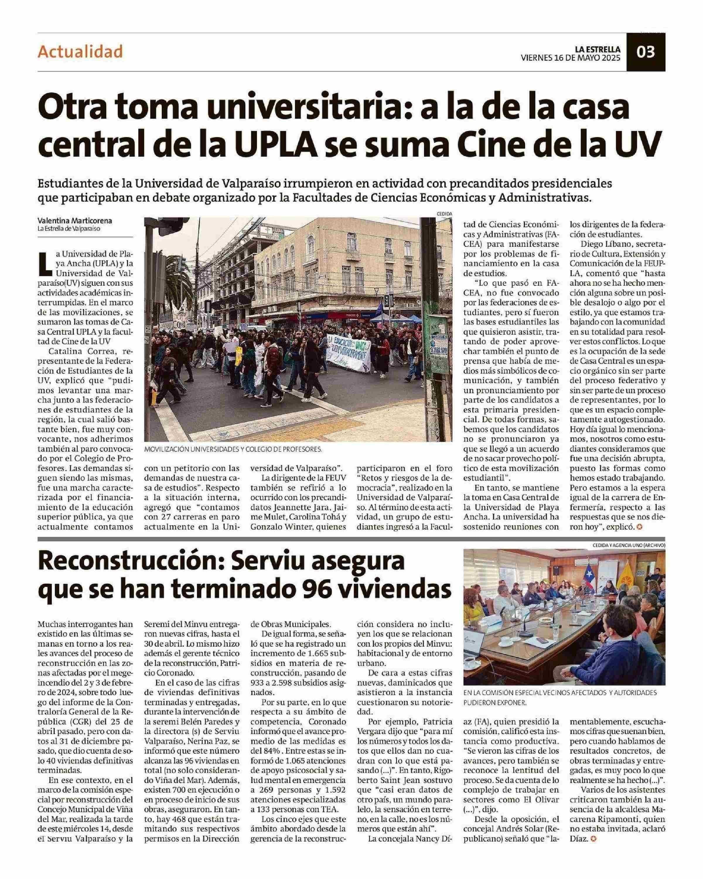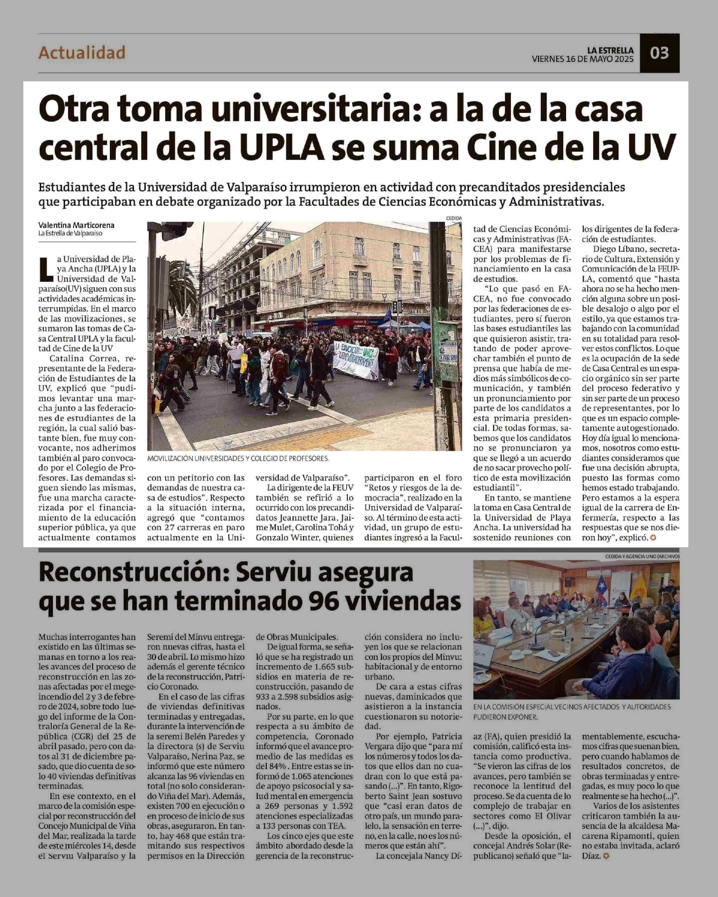 Otra toma universitaria: a la de la casa central de la UPLA se suma Cine de la UV 16-05-2025 La Estrella de Valparaíso |