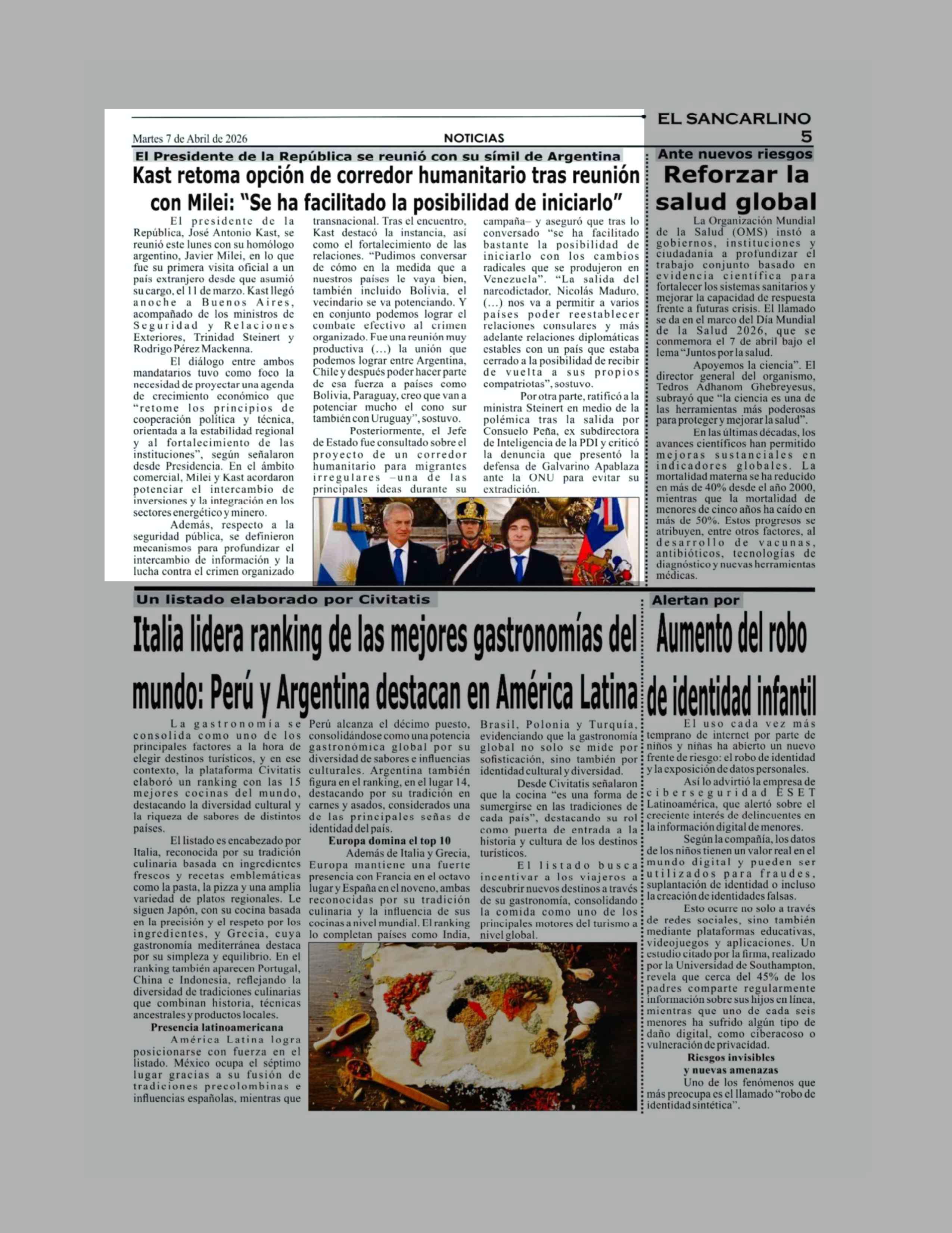 Kast retorna opción de corredor hurnanitario tras reunión con Milei: “Se ha facilitado la posibilidad de iniciarlo” 07-04-2026 El Sancarlino |