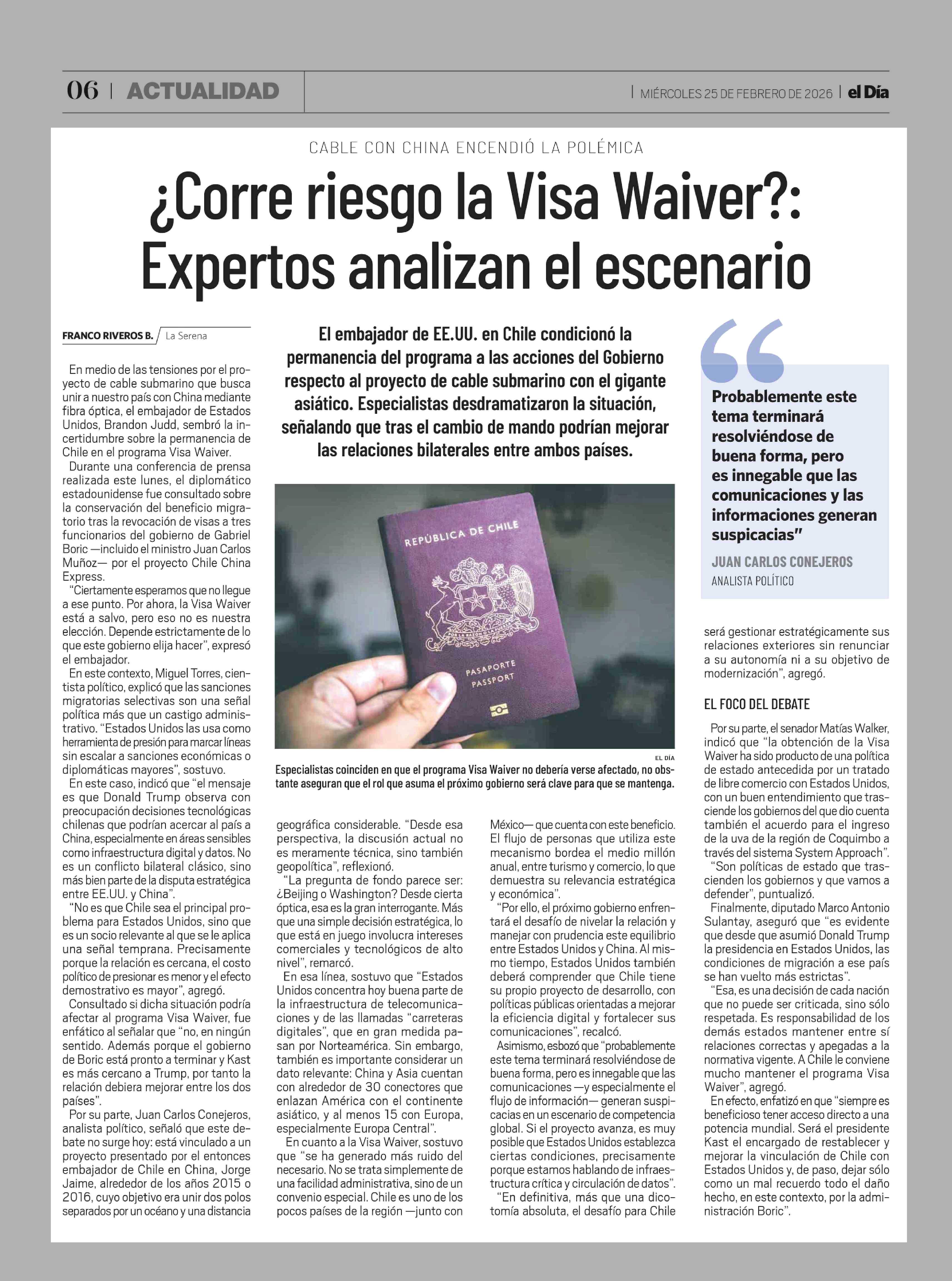 ¿Corre riesgo la Visa Waiver ?: Expertos analizan el escenario 25-02-2026 El Día |