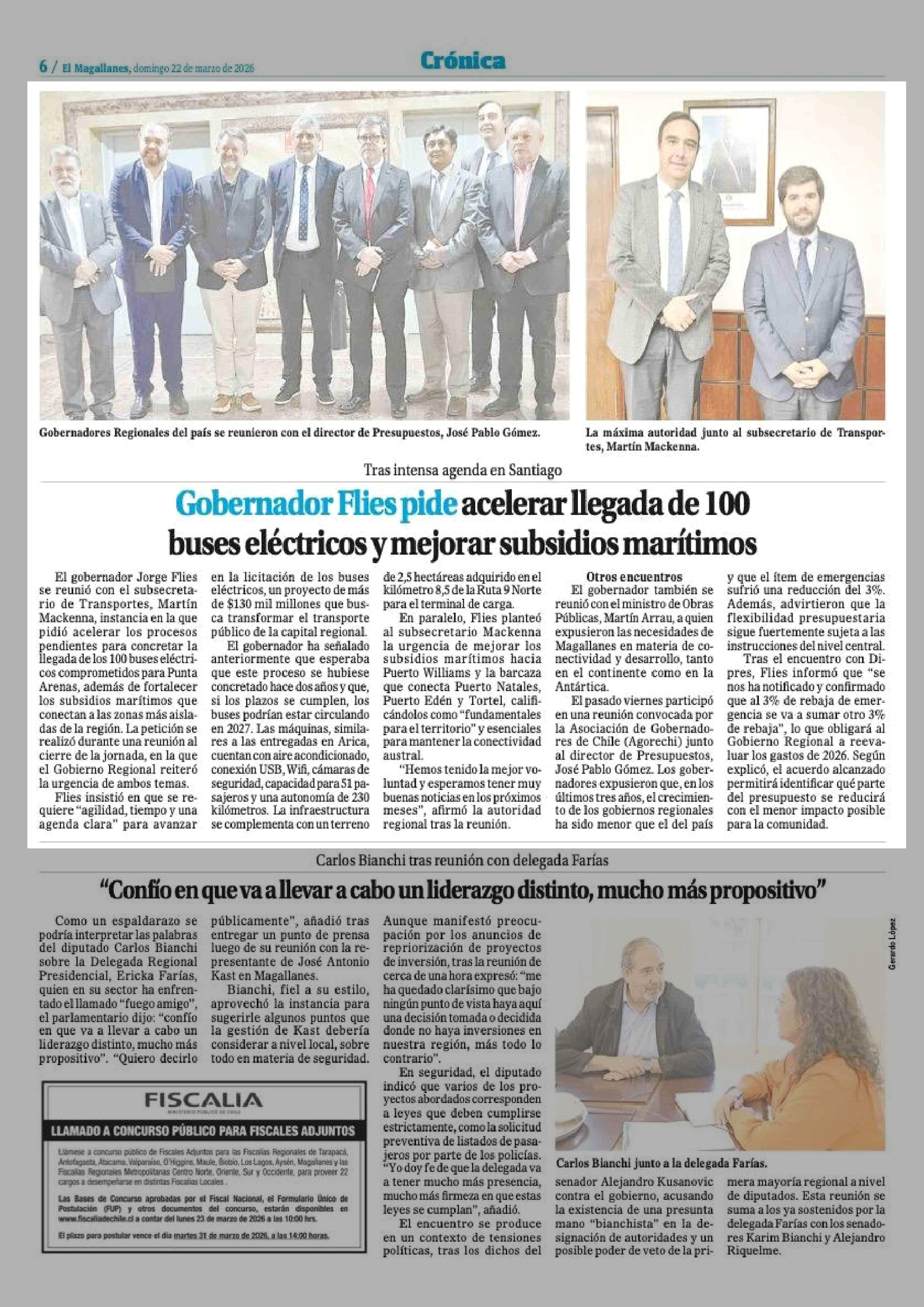 Gobernador Flies pide acelerar llegada de 100 buses eléctricos y mejorar subsidios marítimos 22-03-2026 El Magallanes |