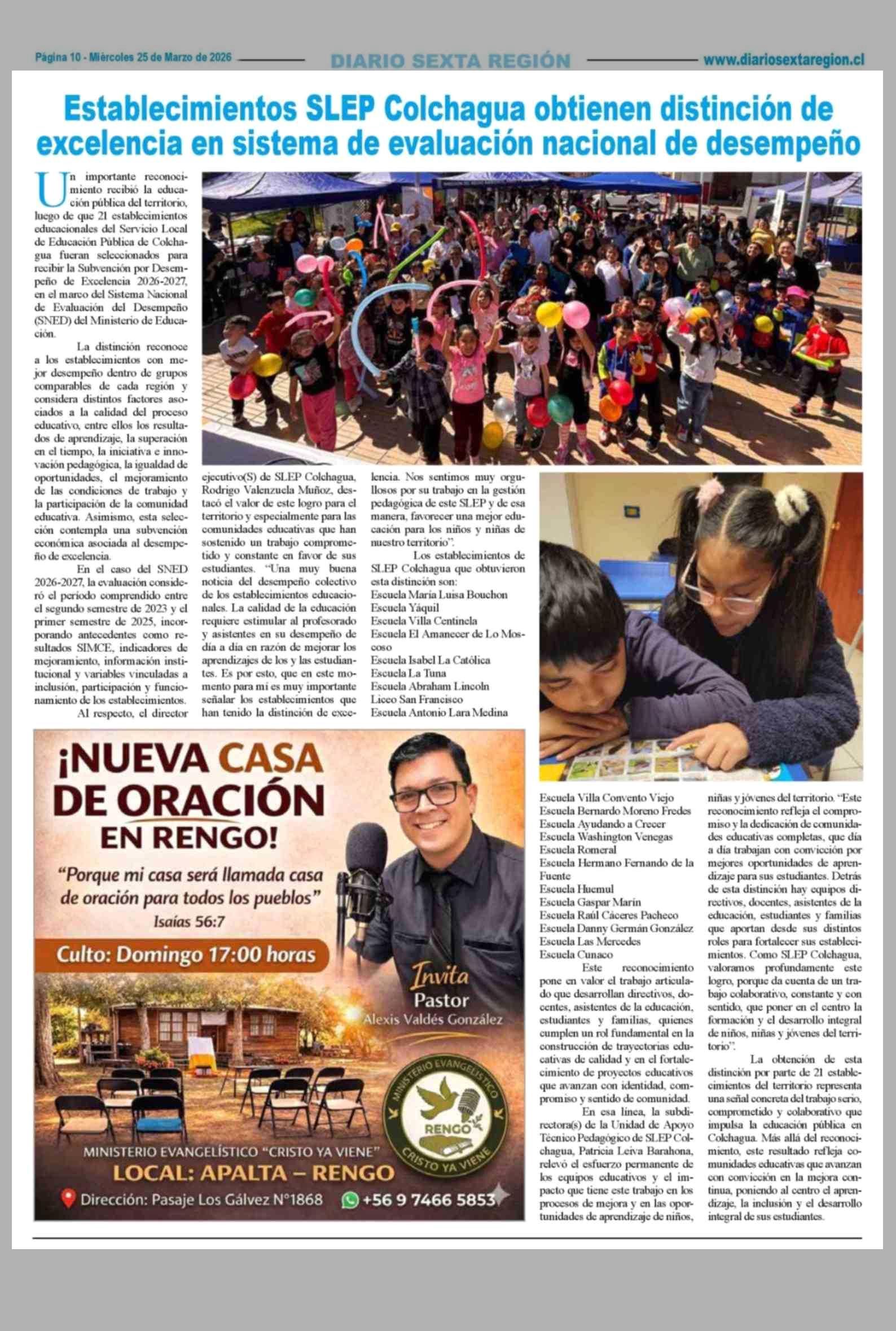 Establecimientos SLEP Colchagua obtienen distinción de excelencia en sistema de evaluación nacional de desempeño 25-03-2026 Diario VI Región |