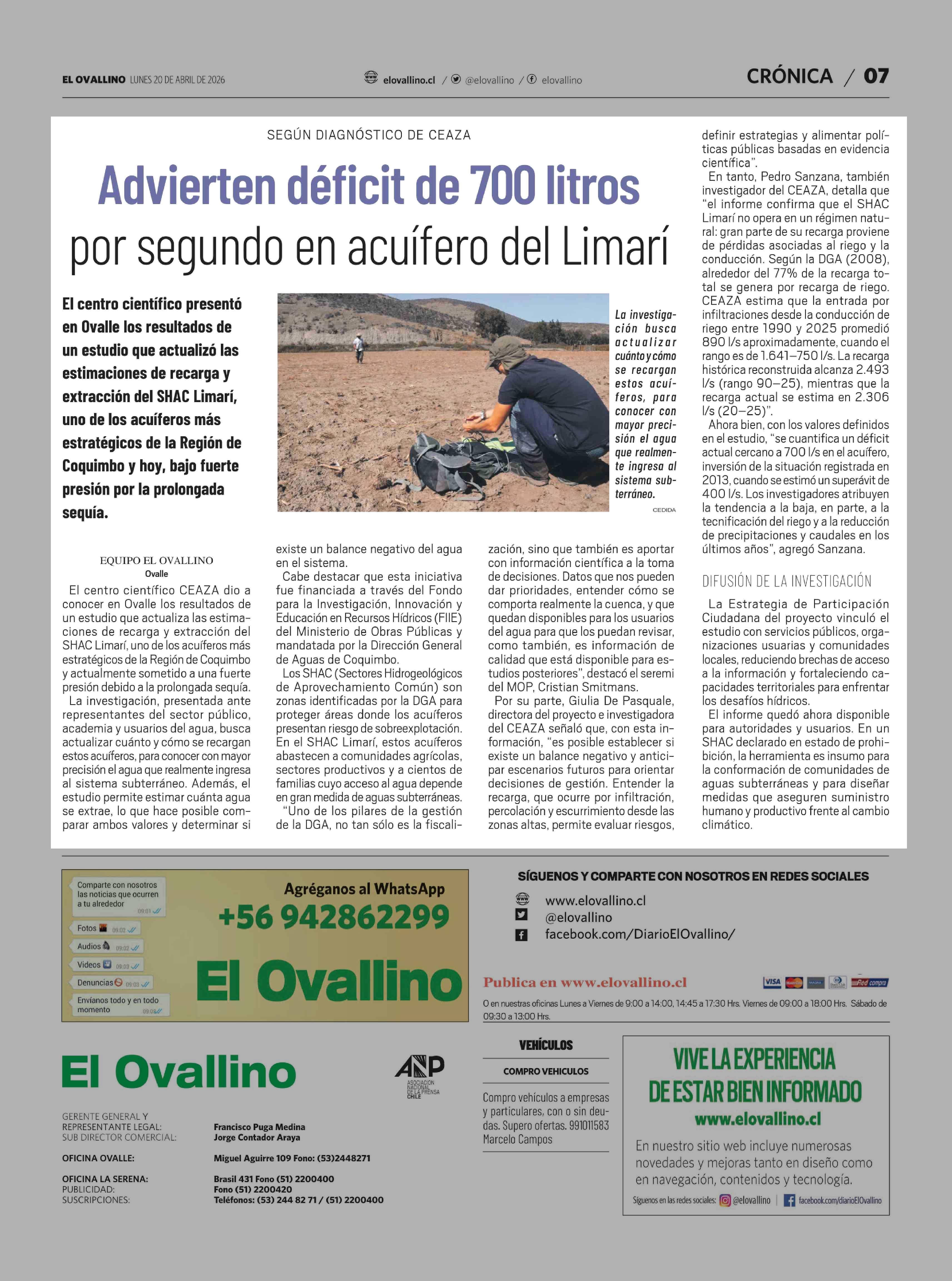 Advierten déficit de 700 litros por segundo en acuífero del Limarí 20-04-2026 El Ovallino |