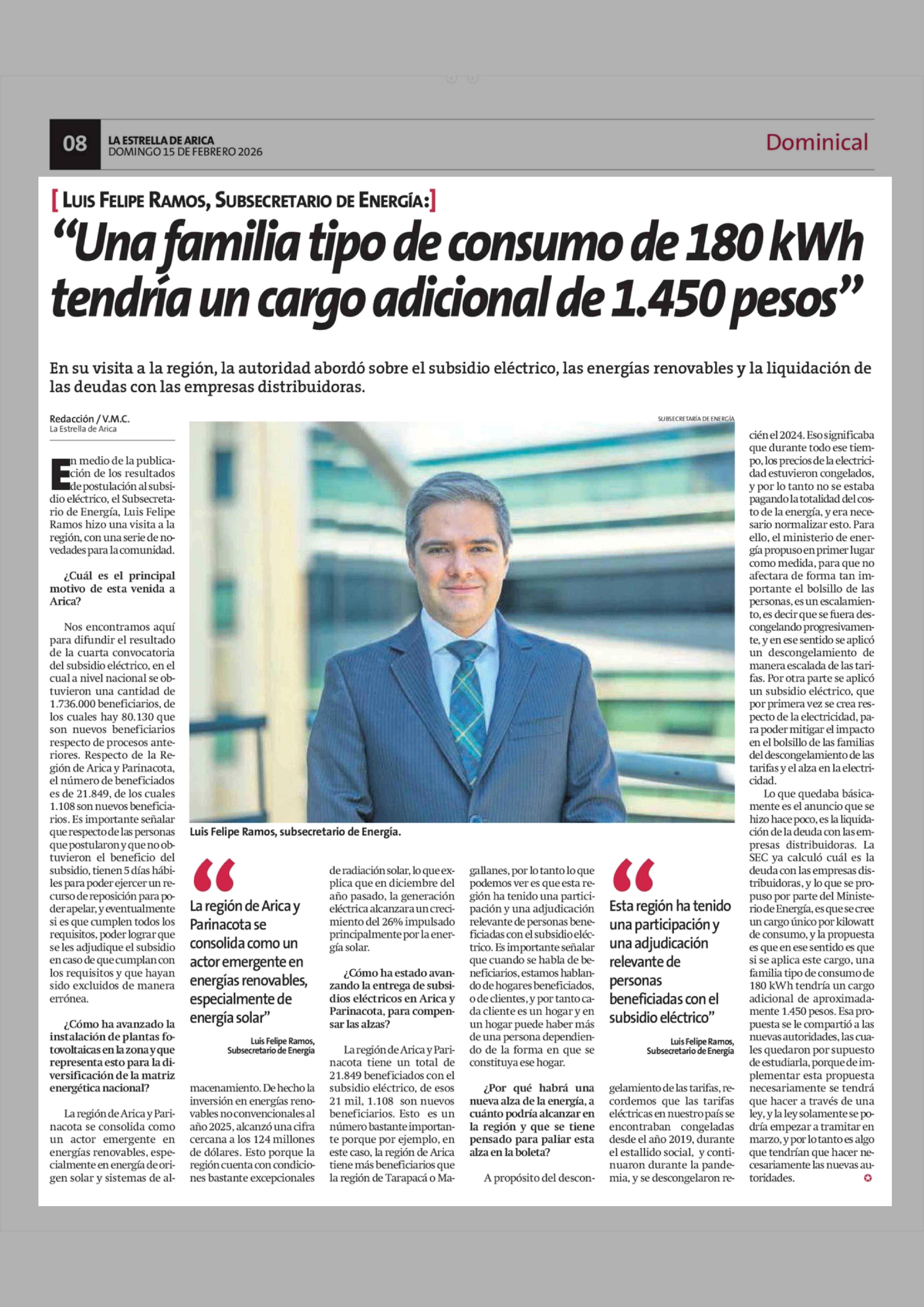 "Una familia tipo de consumo de 180 kWh tendría un cargo adicional de 1.450 pesos" 15-02-2026 La Estrella de Arica |