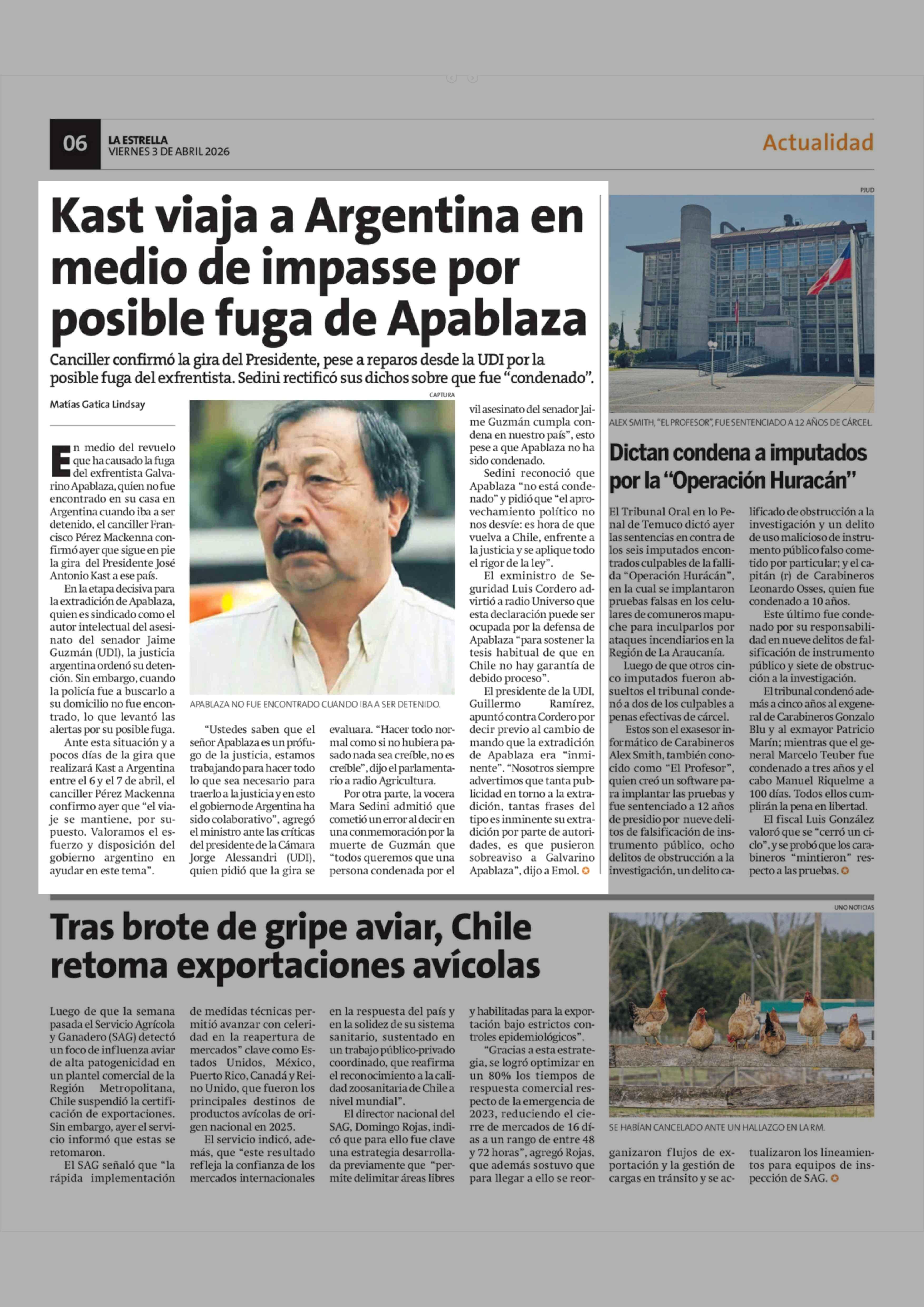 Título: Kast viaja a Argentina en medio de impasse por posible fuga de Apablaza