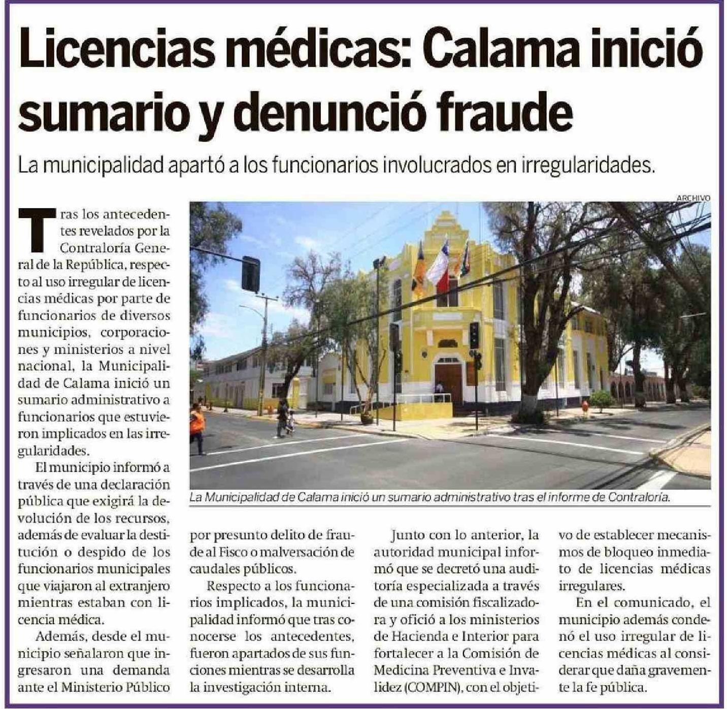 Título: Licencias médicas: Calama inició sumario y denunció fraude
