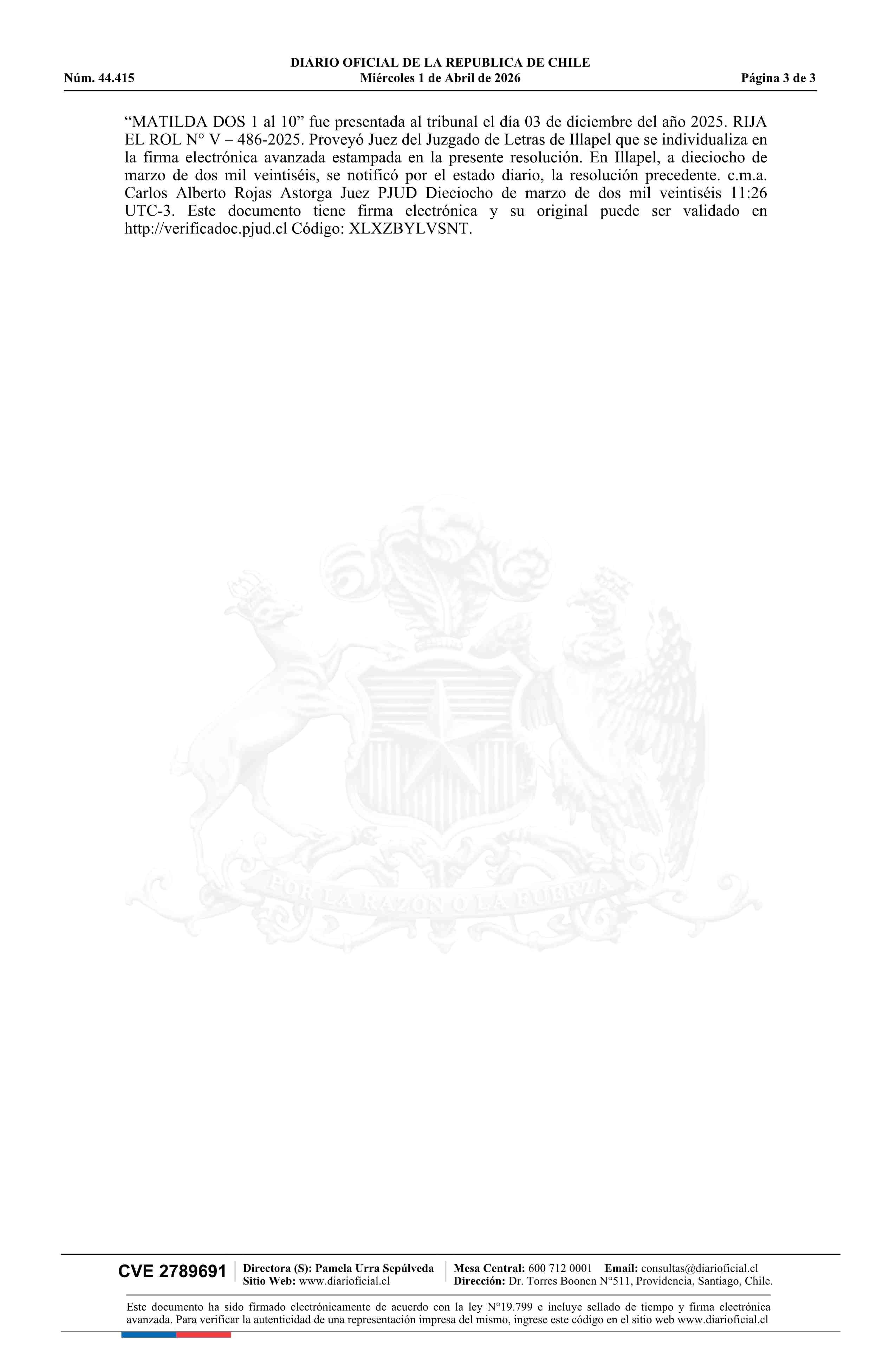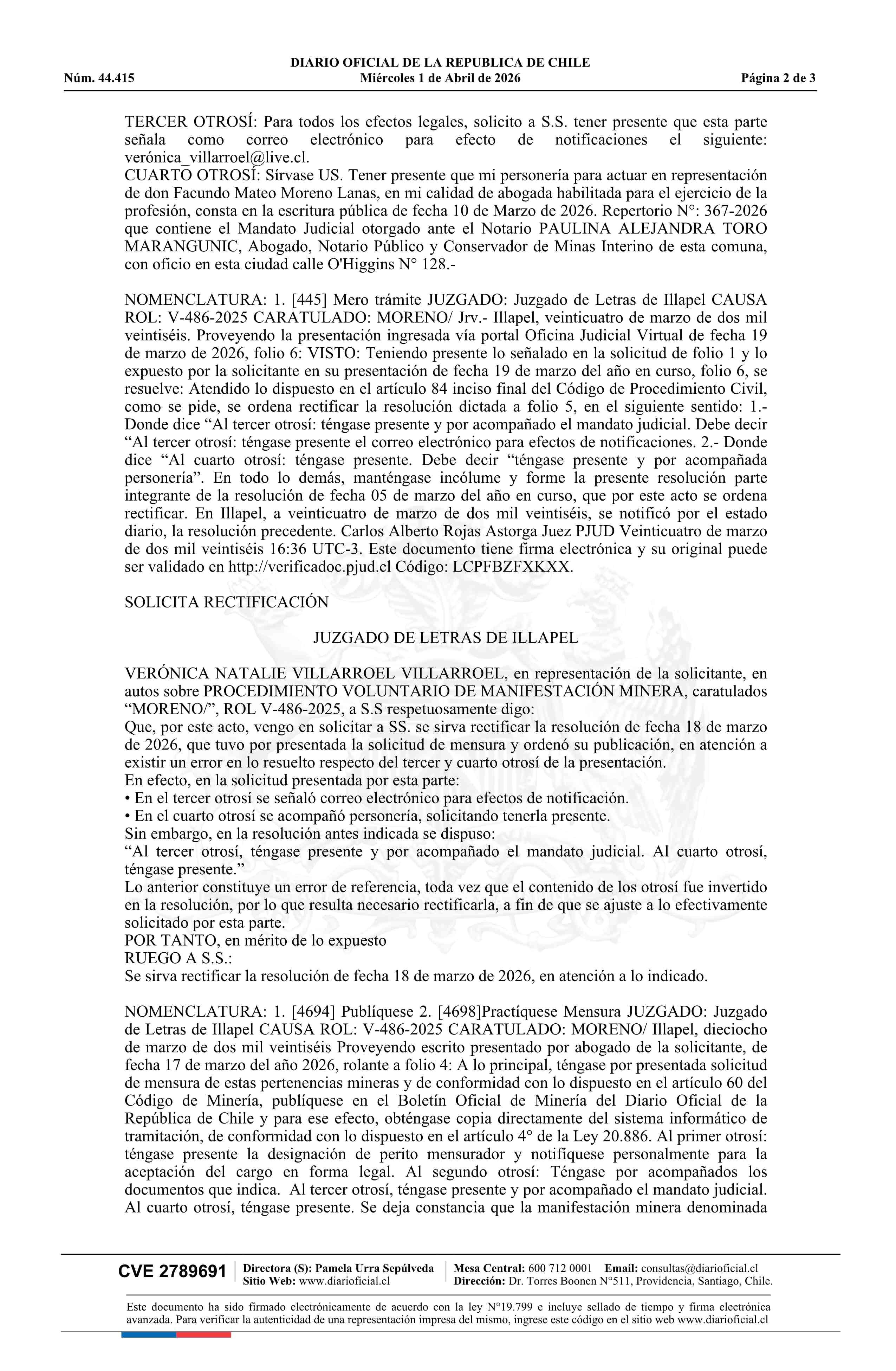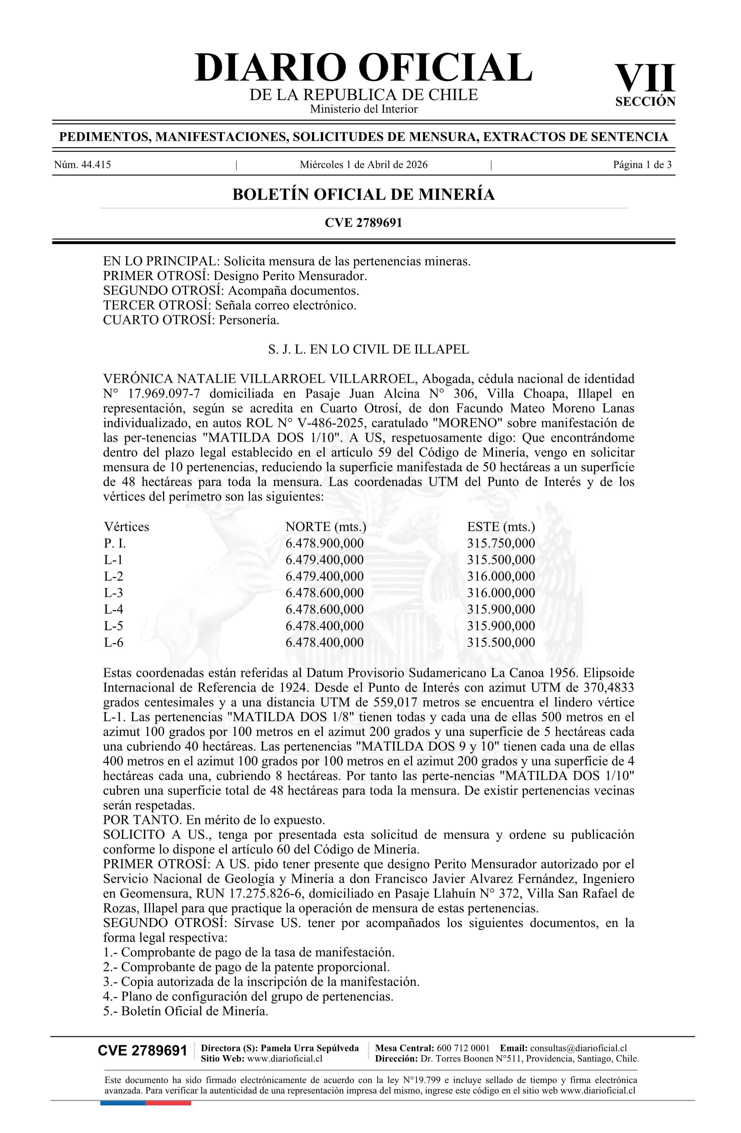 MATILDA DOS 1/10 / Moreno Lanas Facundo Mateo 01-04-2026 DIARIO OFICIAL CHILE - BOLETÍN OFICIAL DE MINERÍA |