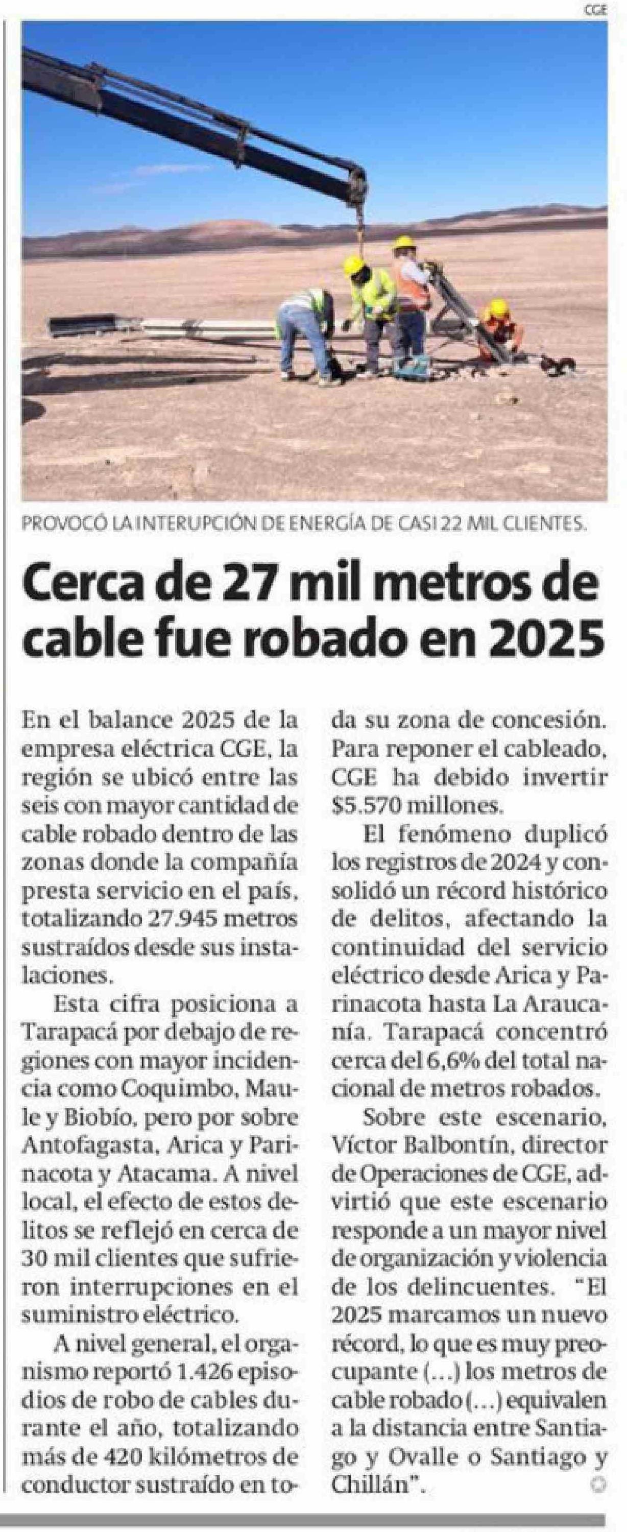 Título: Cerca de 27 mil metros de cable fue robado en 2025