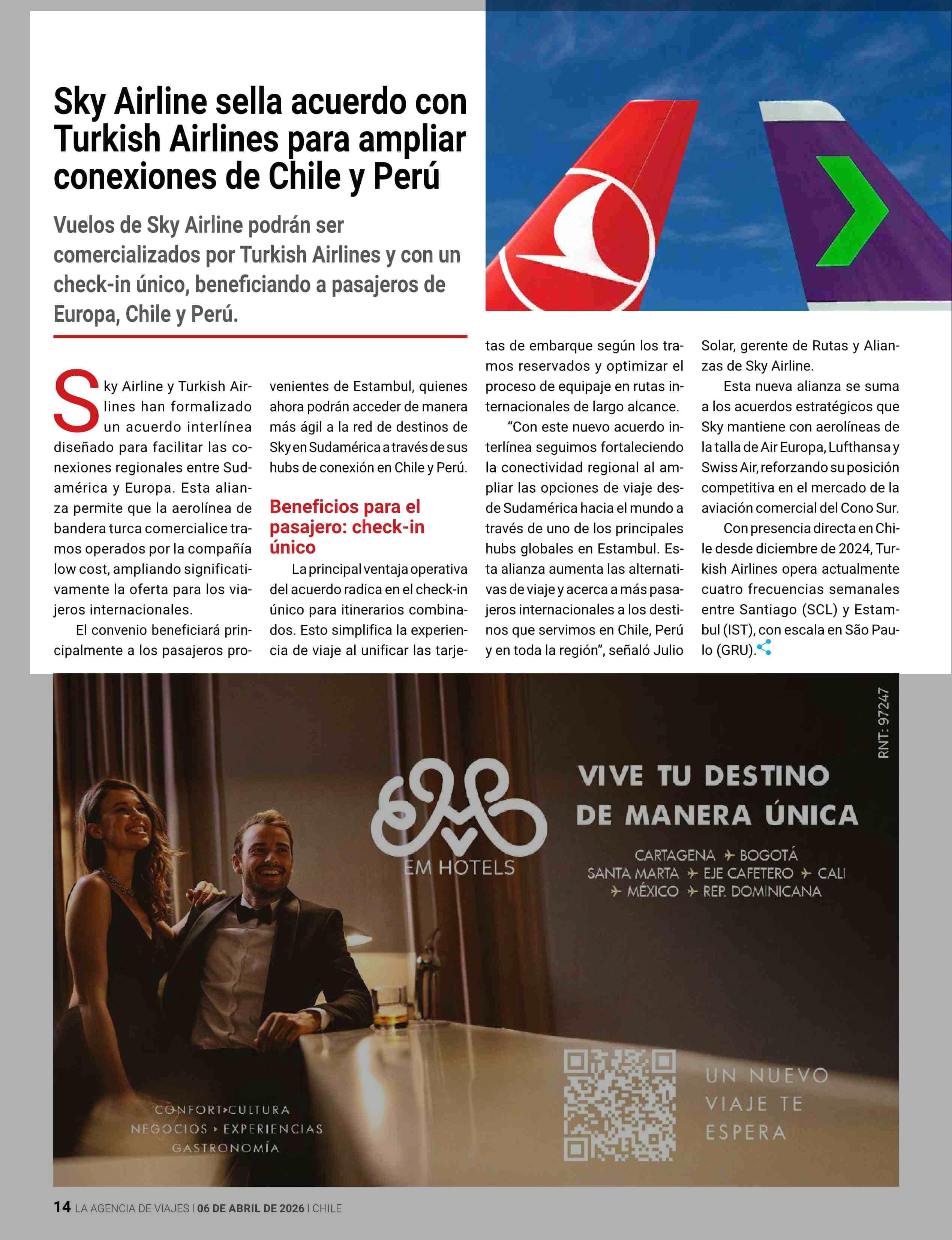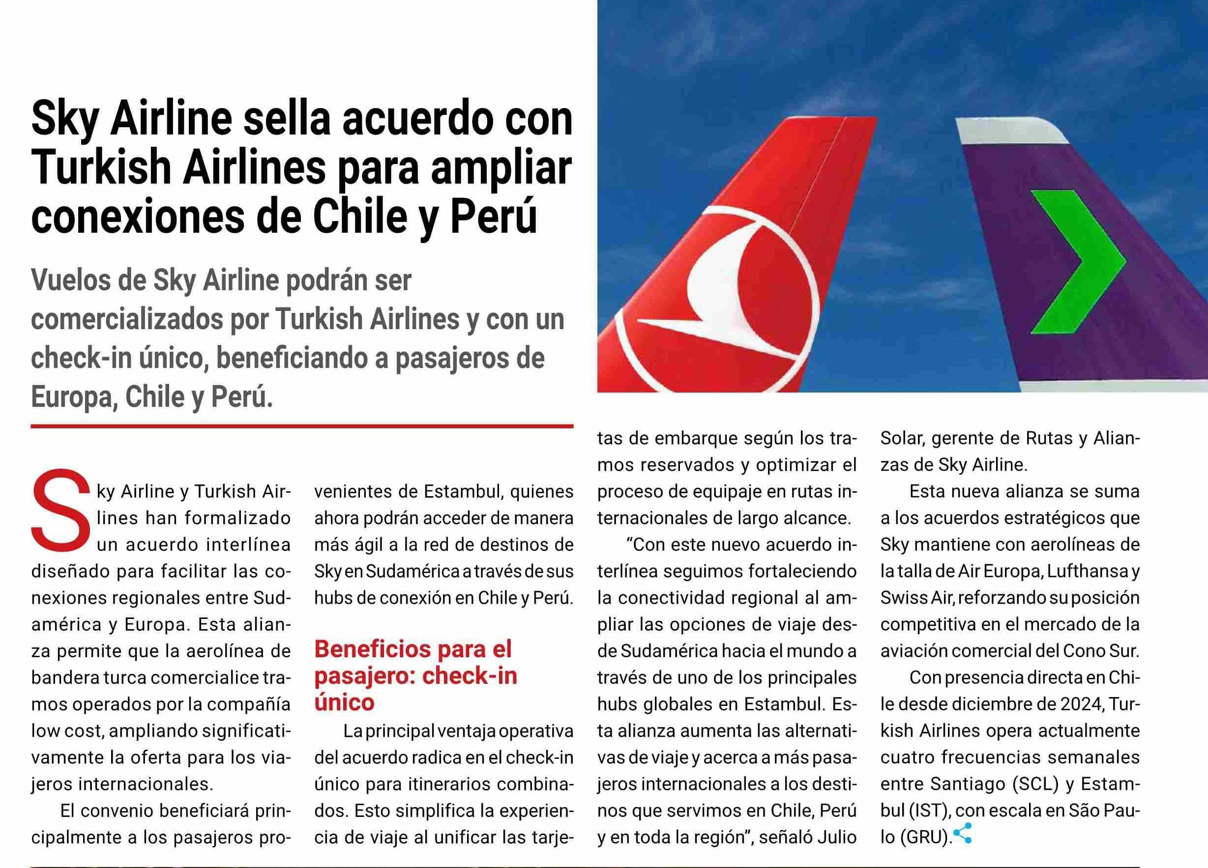 Sky Airline sella acuerdo con Turkish Airlines para ampliar conexiones de Chile y Perú 13-04-2026 Revista La Agencia de Viajes |