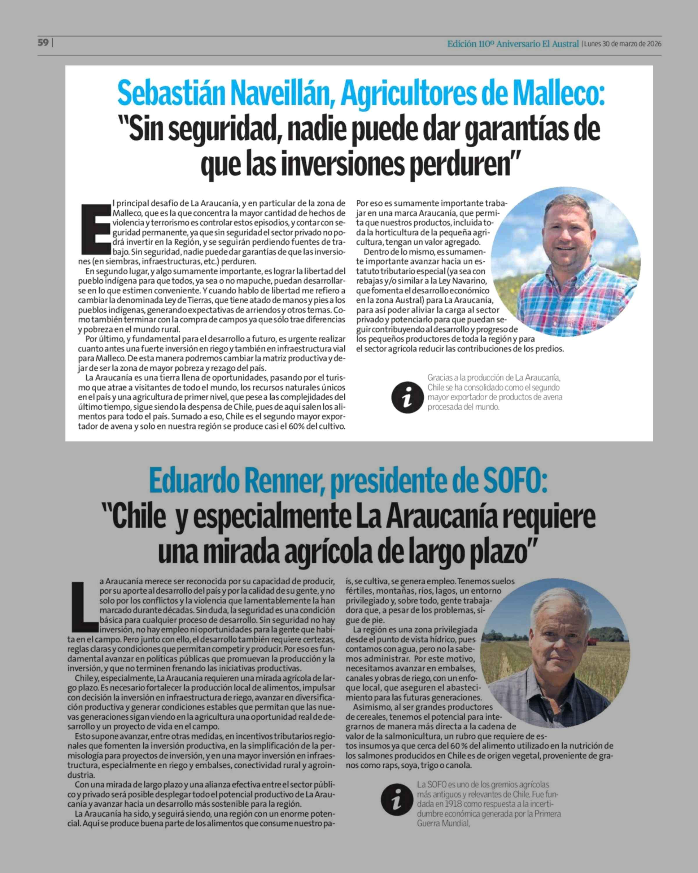 Columnas de Opinión: Sebastián Naveillán, Agricultores de Malleco: "Sin seguridad, nadie puede dar garantías de que las inversiones perduren" 30-03-2026 El Austral de la Araucanía |