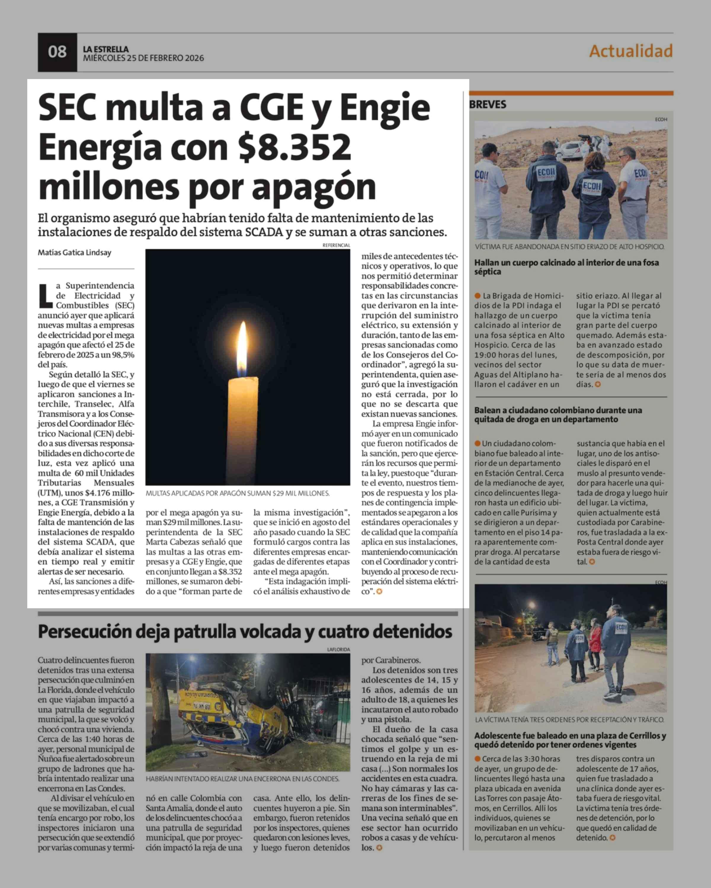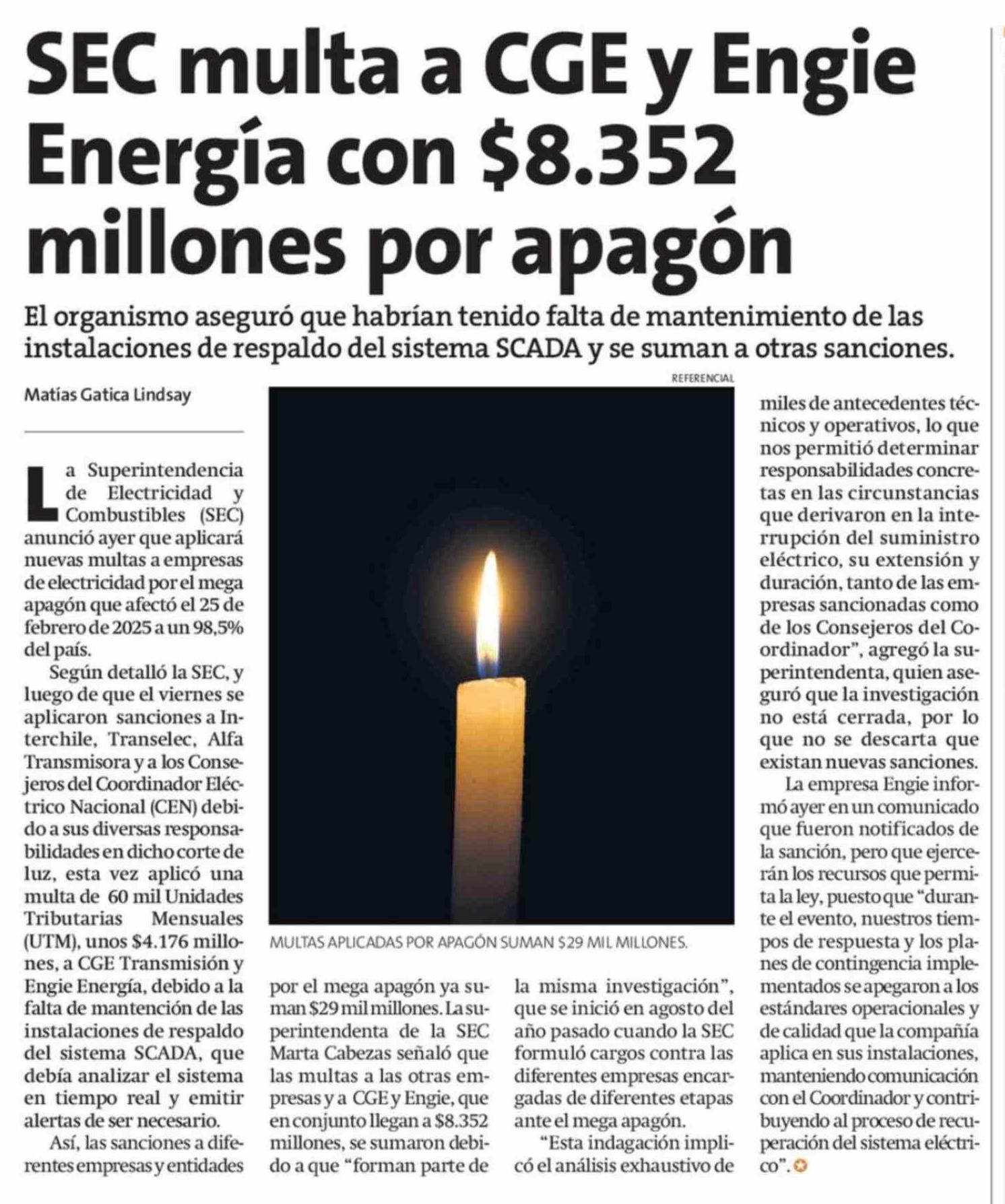 SEC multa a CGE y Engie Energía con $8.352 millones por apagón 25-02-2026 La Estrella de Concepción |