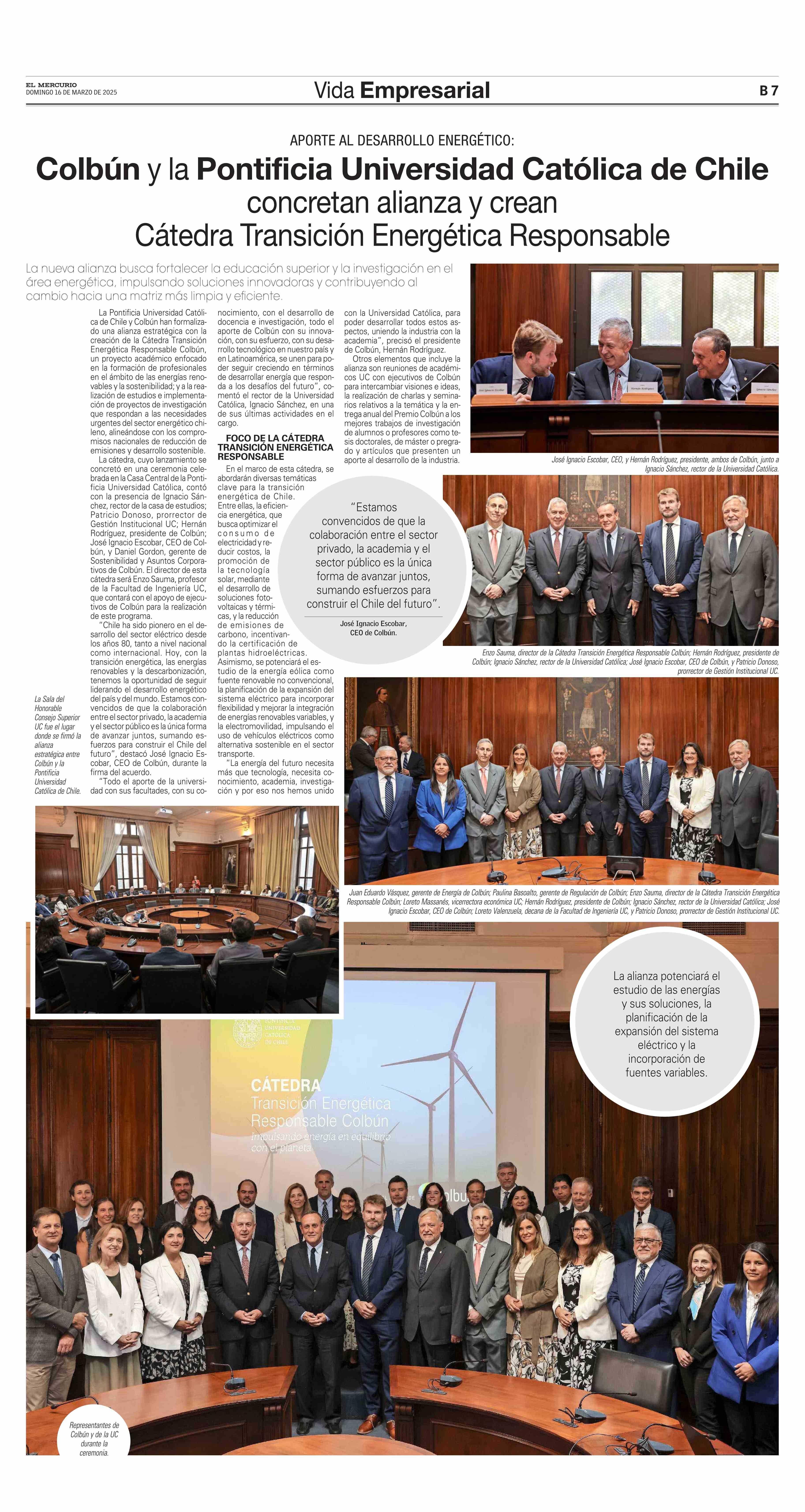 Colbún y la Pontificia Universidad Católica de Chile concretan alianza y crean Cátedra Transición Energética Responsable 16-03-2025 El Mercurio |
