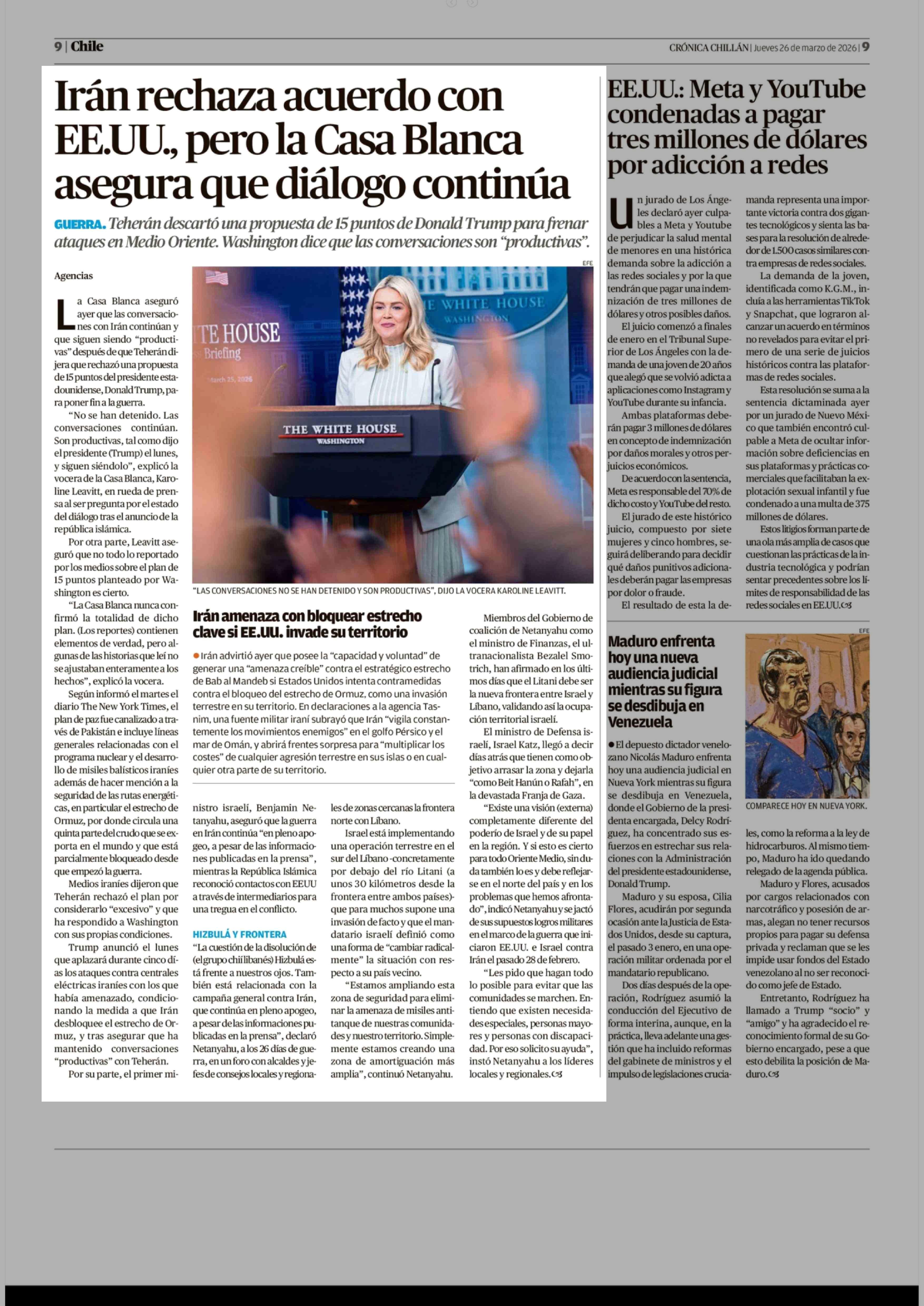 Irán rechaza acuerdo con EE.UU., pero la Casa Blanca asegura que diálogo continúa 26-03-2026 Crónica de Chillán |