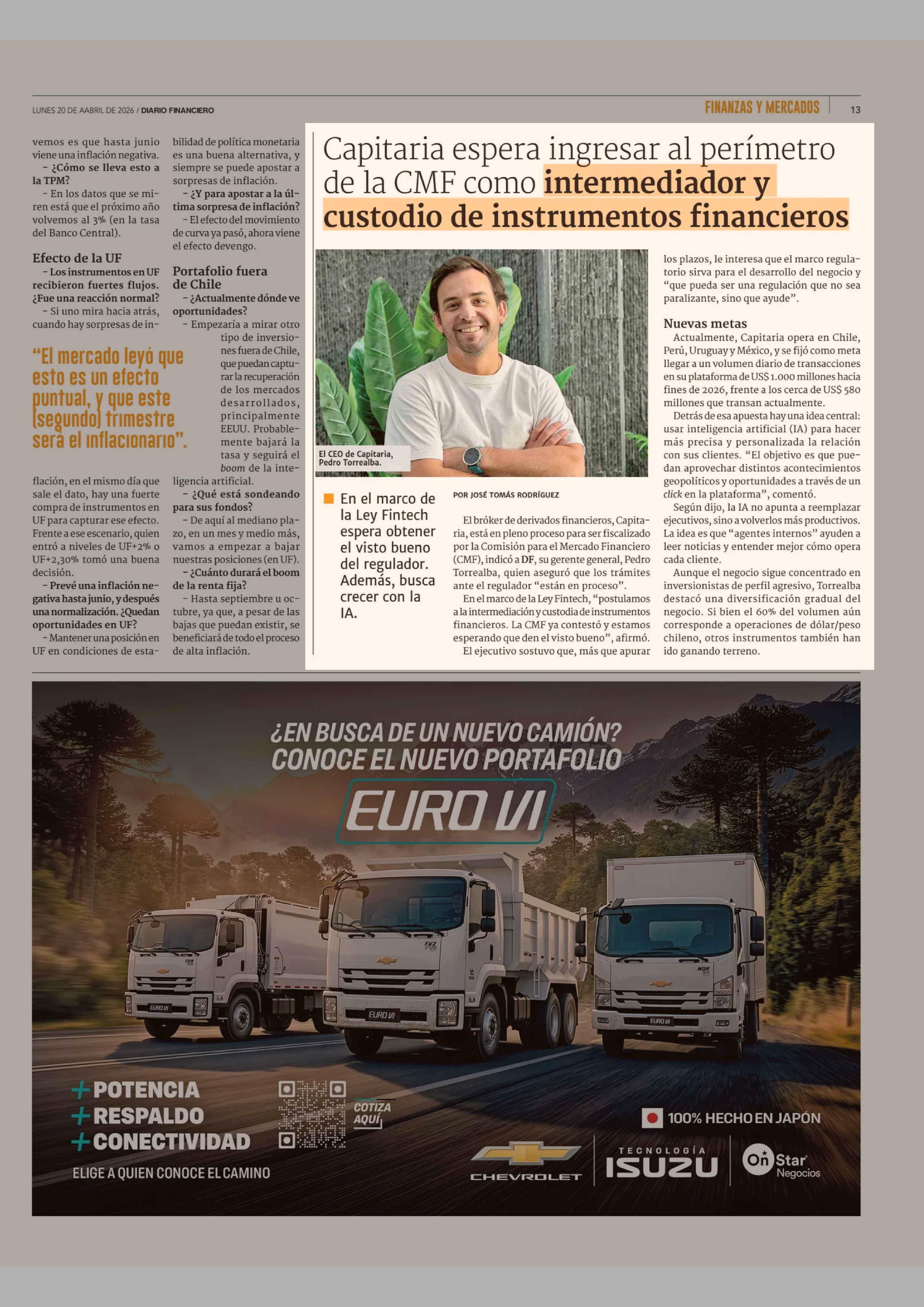 Capitaria espera ingresar al perímetro de la CMF como intermediador y custodio de instrumentos financieros 20-04-2026 Diario Financiero |