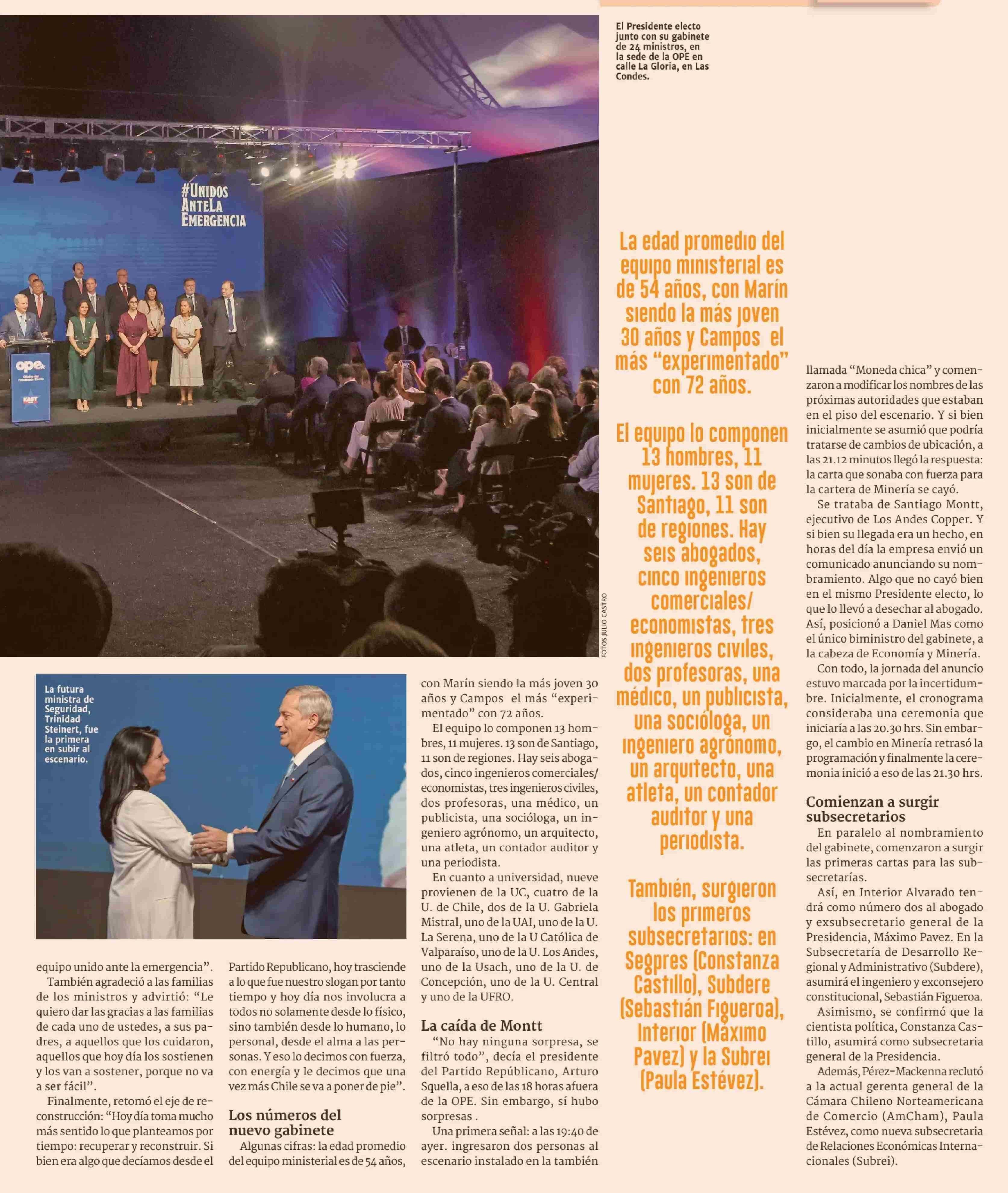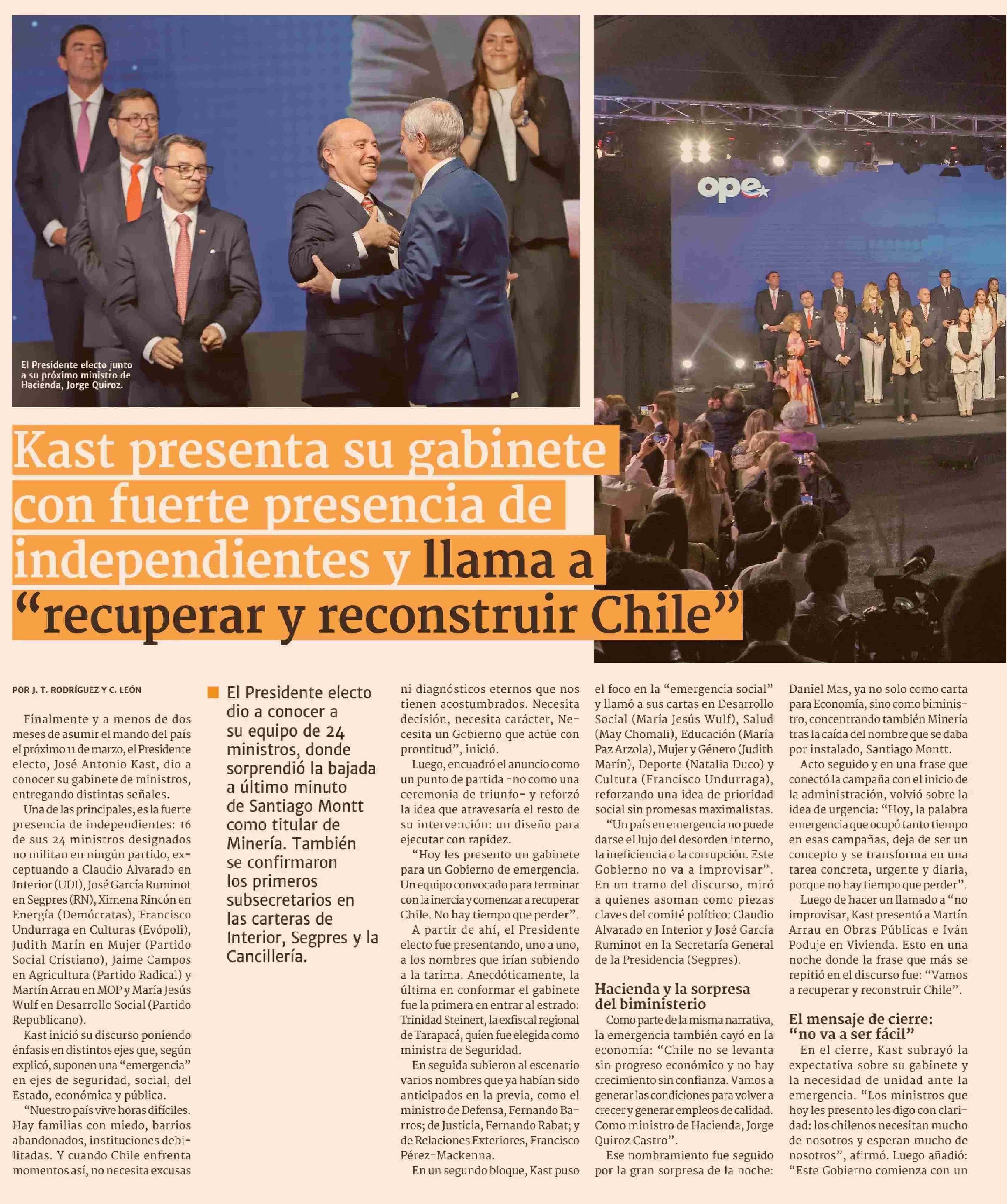 Kast presenta su gabinete con fuerte presencia de independientes y llama a "recuperar y reconstruir Chile 21-01-2026 Diario Financiero |