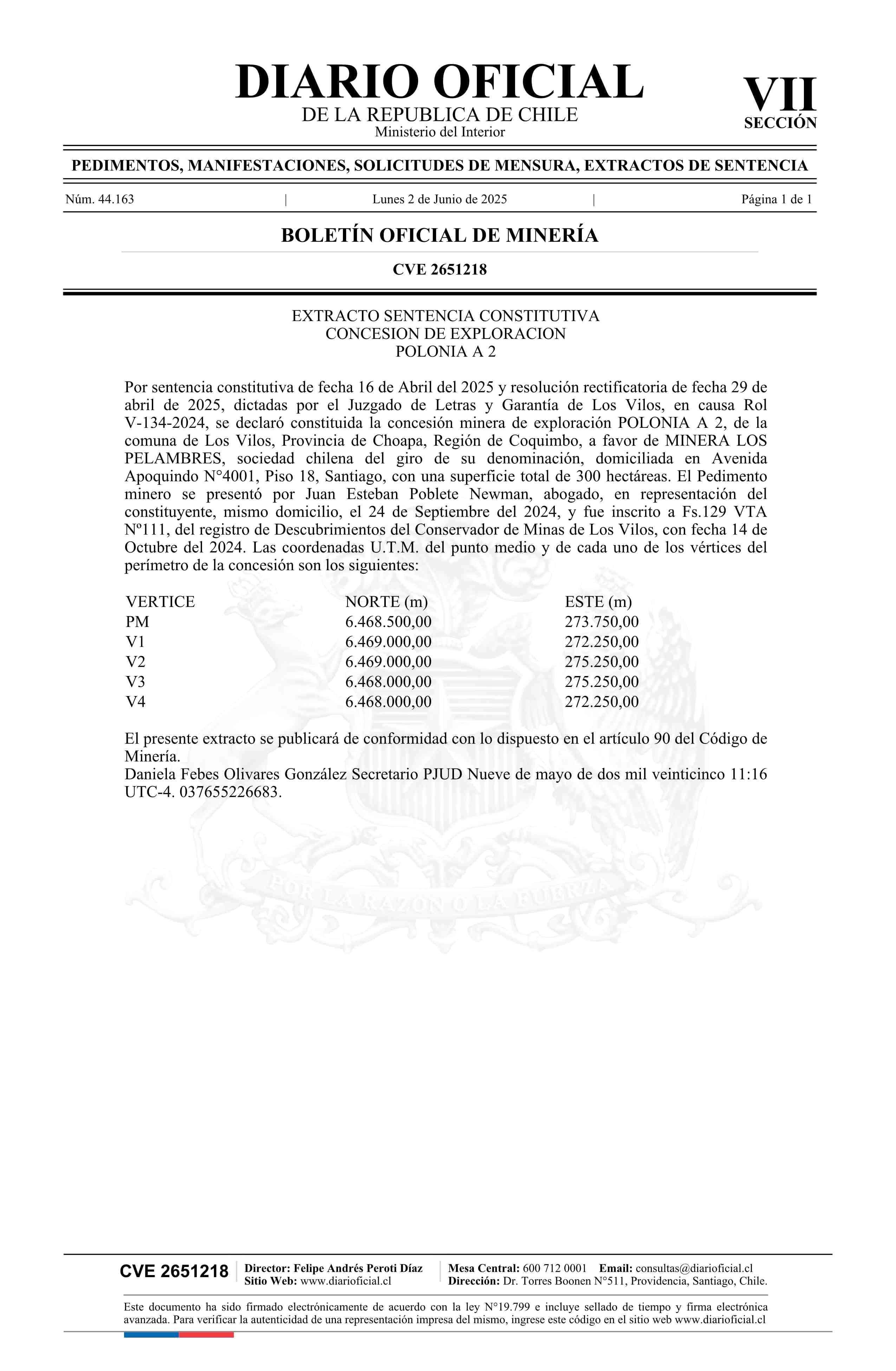 POLONIA A 2 / Minera Los Pelambres 02-06-2025 DIARIO OFICIAL CHILE - BOLETÍN OFICIAL DE MINERÍA |