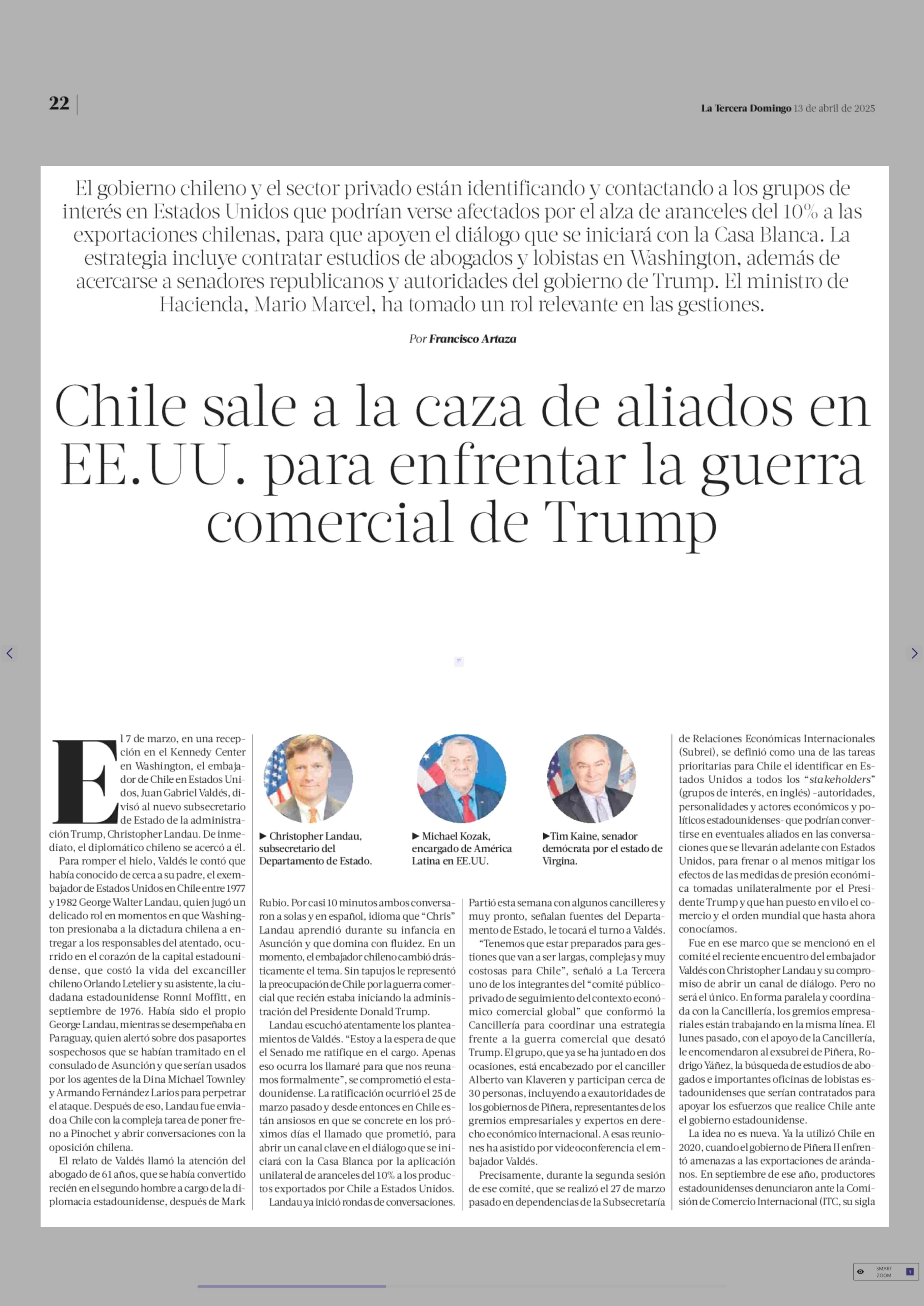 Chile sale a la caza de aliados en EE.UU. para enfrentar la guerra de Trump comercial 13-04-2025 La Tercera |