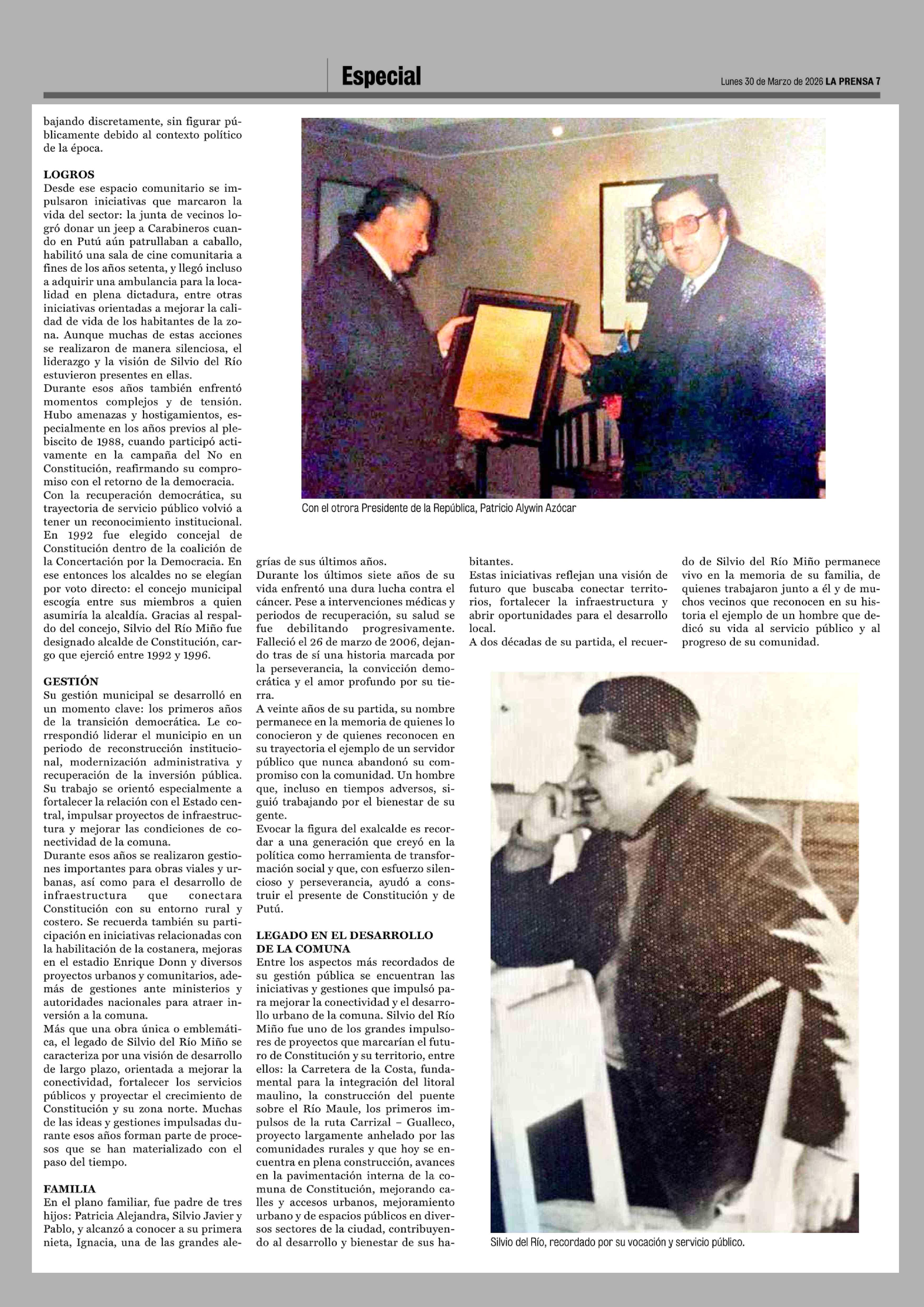 Silvio del Río Miño: 20 años de ausencia, una vida que sigue marcando el corazón social y político de Constitución 30-03-2026 La Prensa de Curicó |