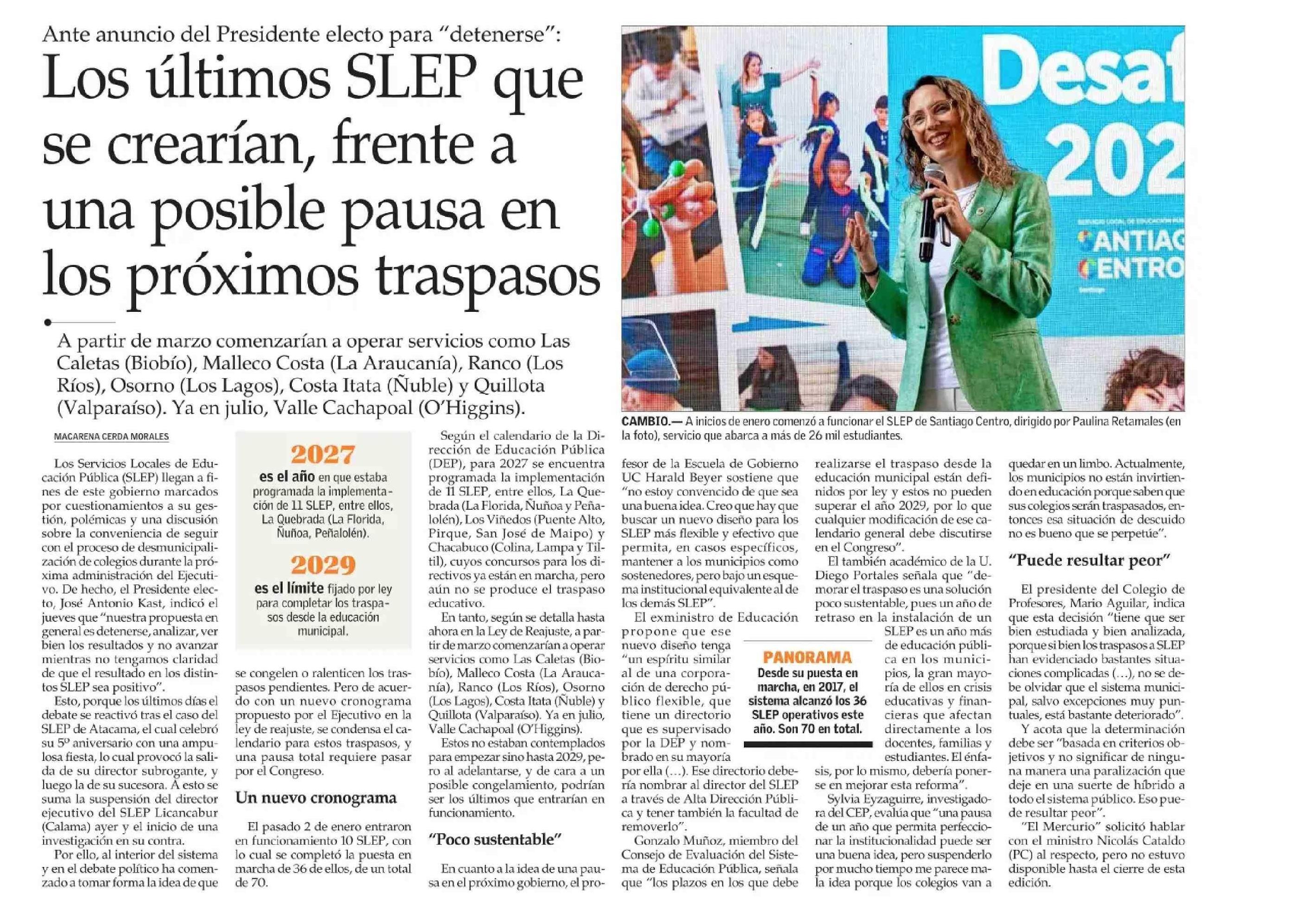 Los últimos SLEP que se crearían, frente a una posible pausa en los próximos traspasos 17-01-2026 El Mercurio |