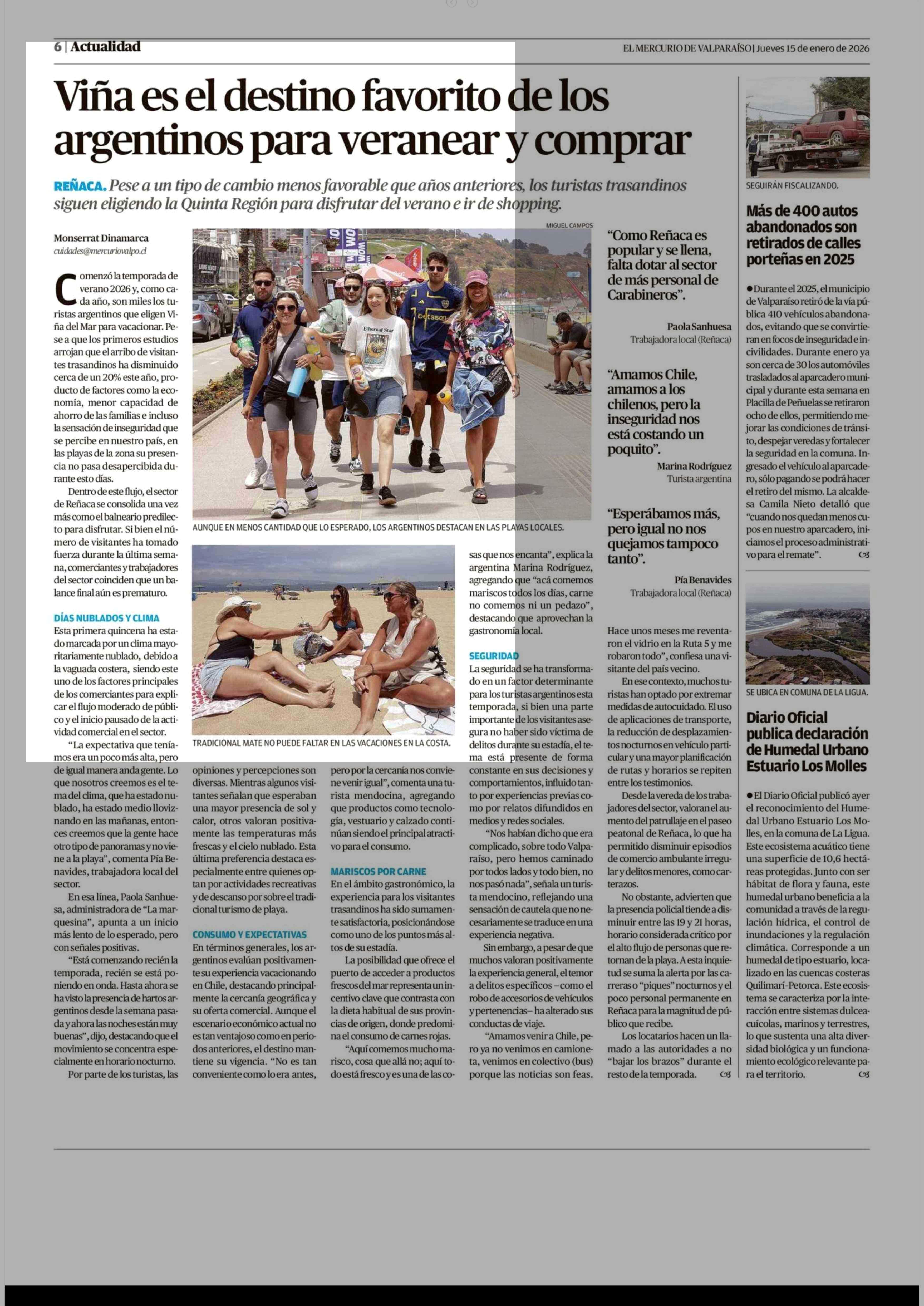 Viña es el destino favorito de los argentinos para veranear y comprar 15-01-2026 El Mercurio de Valparaíso |