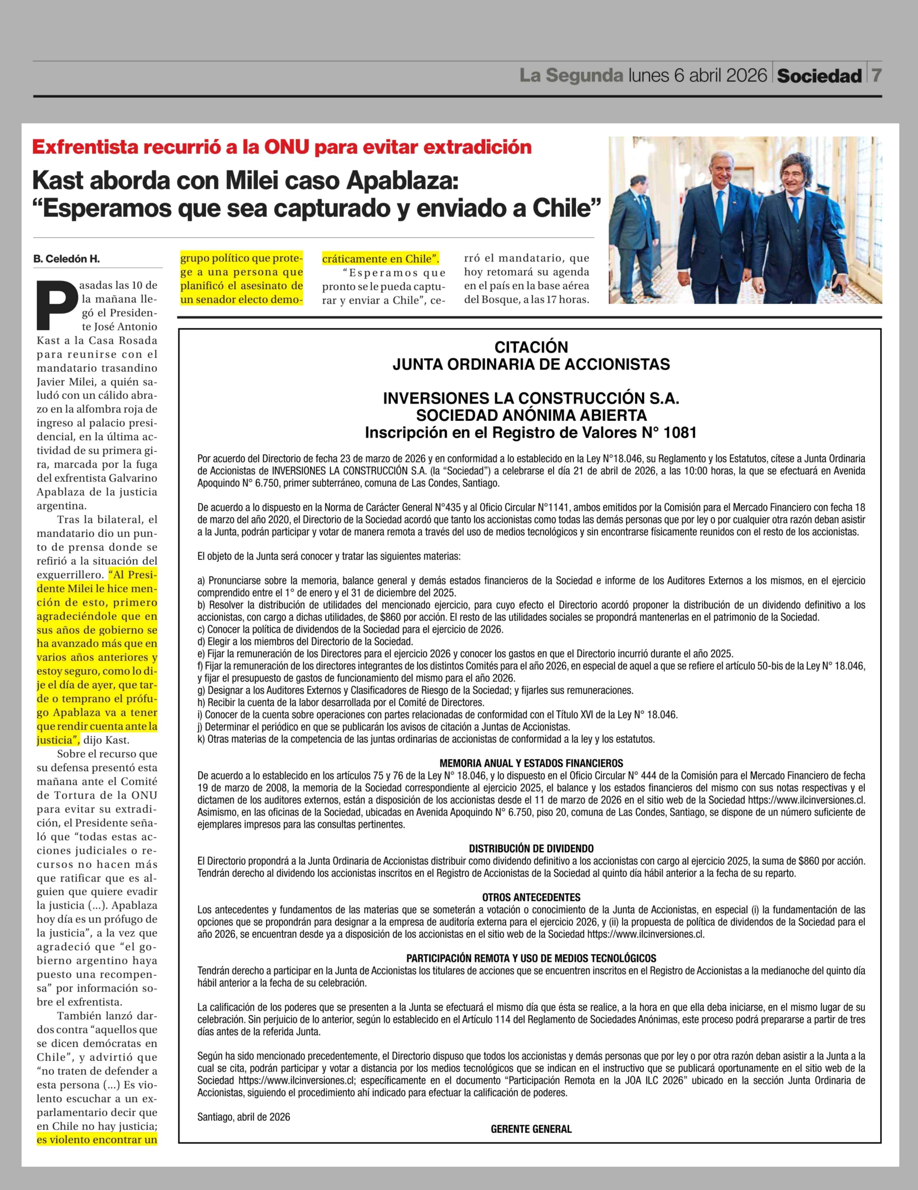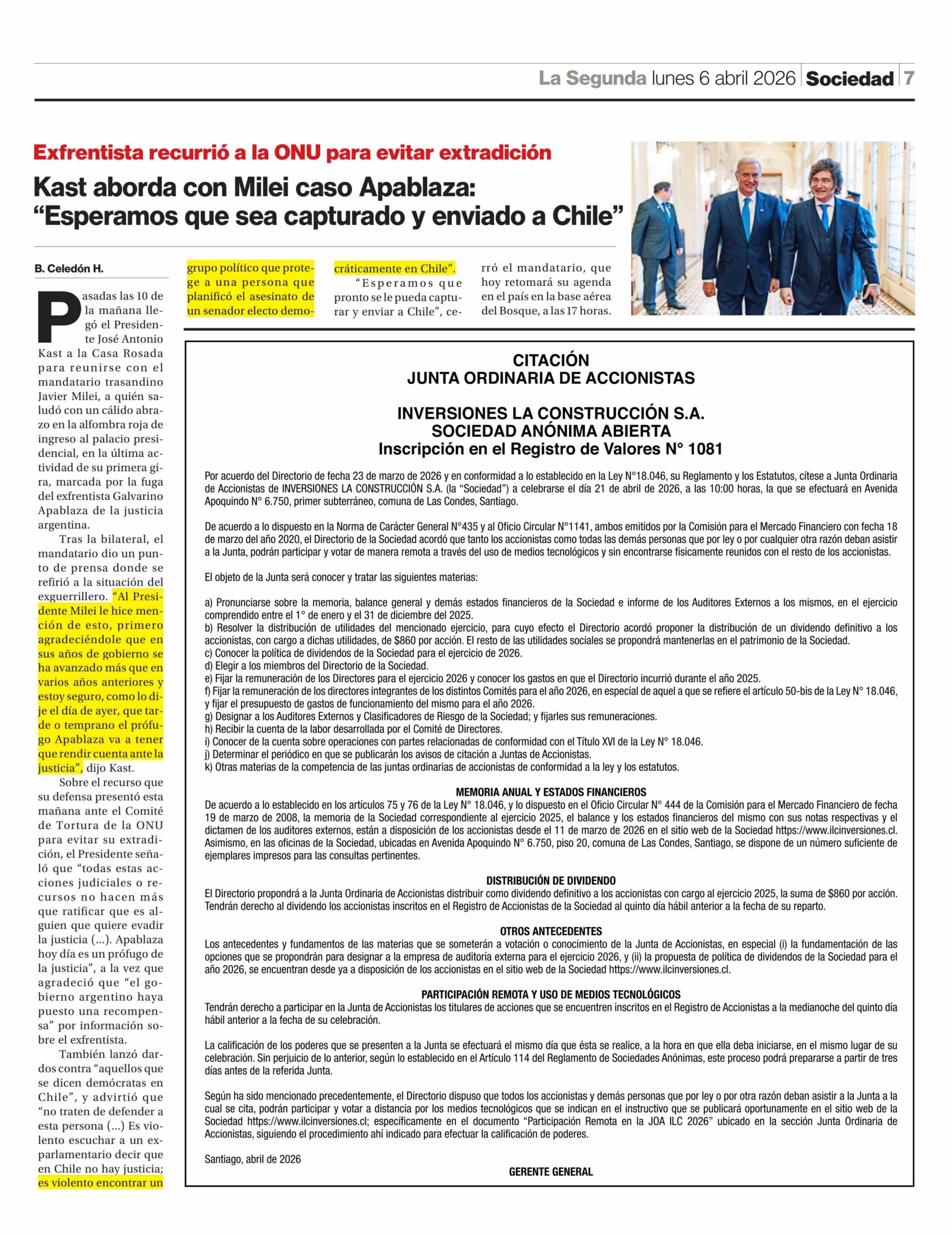 Kast aborda con Milei caso Apablaza: "Esperamos que sea capturado y enviado a Chile" 06-04-2026 La Segunda |