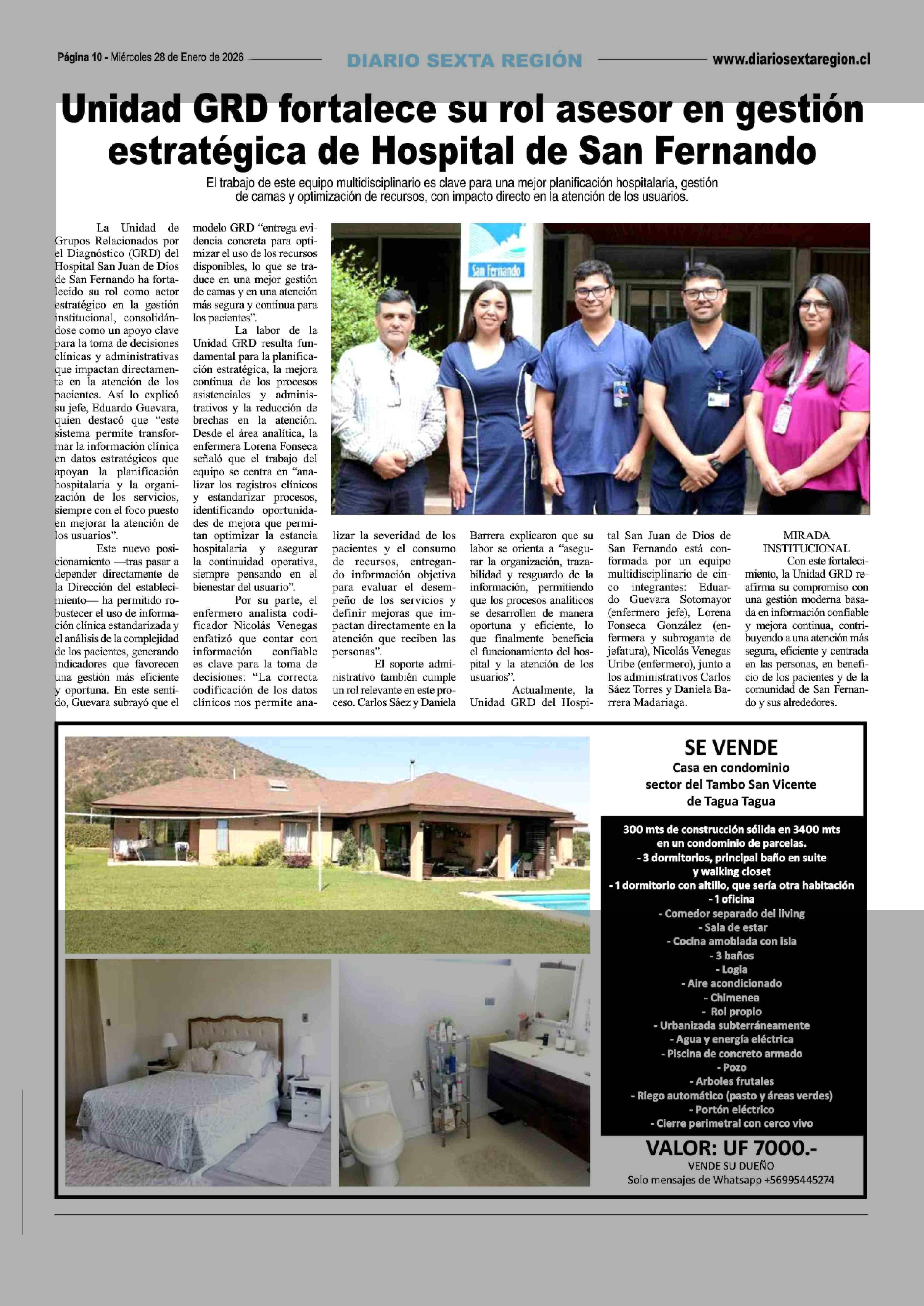 Unidad GRD fortalece su rol asesor en gestión estratégica de Hospital de San Fernando 28-01-2026 Diario VI Región |