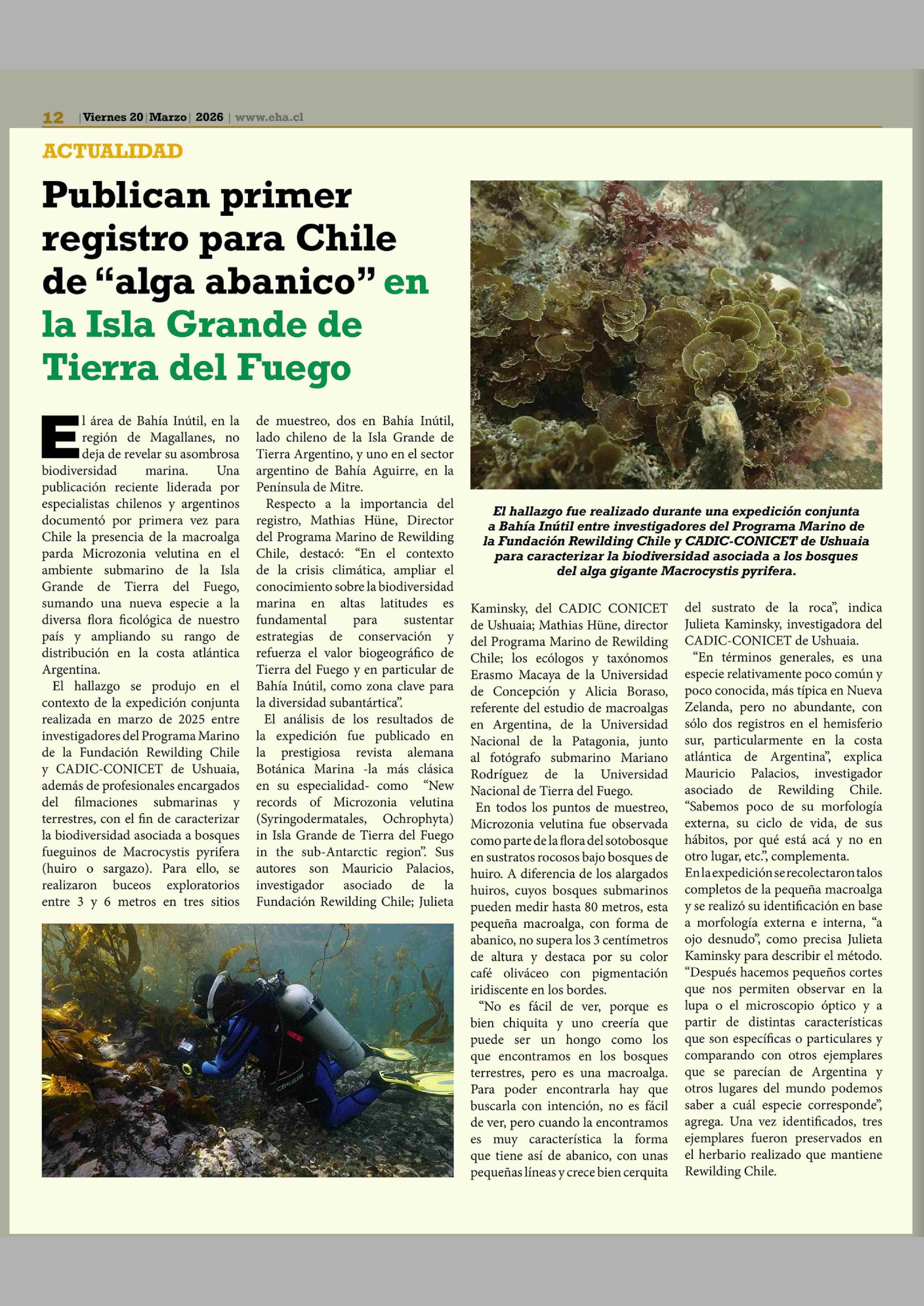 Publican primer registro para Chile de “alga abanico” en la Isla Grande de Tierra del Fuego 20-03-2026 El Heraldo Austral |