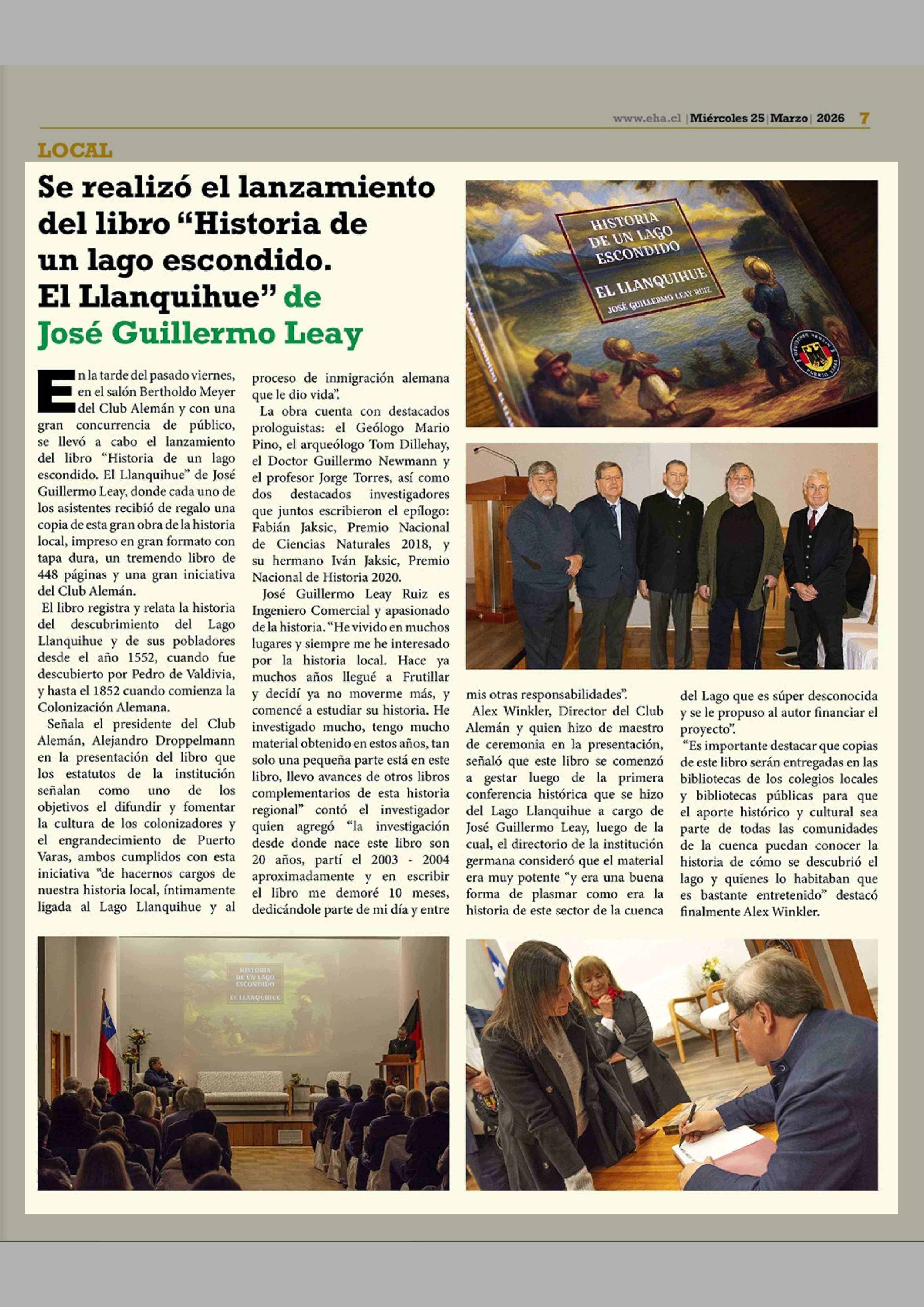Se realizó el lanzamiento del libro "Historia de un lago escondido. El Llanquihue" de José Guillermo Leay