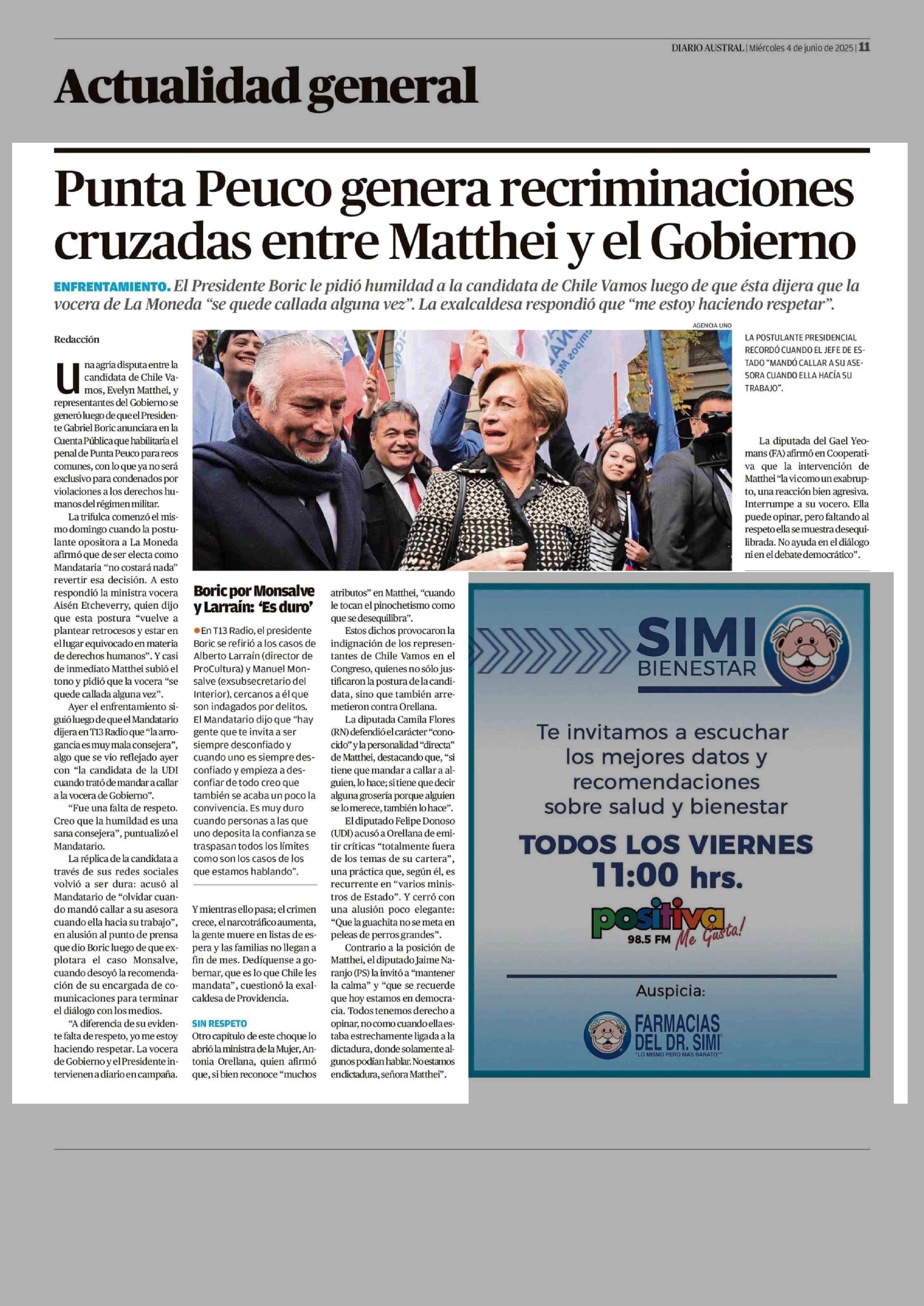 Punta Peuco genera recriminaciones cruzadas entre Matthei v el Gobierno 04-06-2025 Diario Austral Región de Los Ríos |