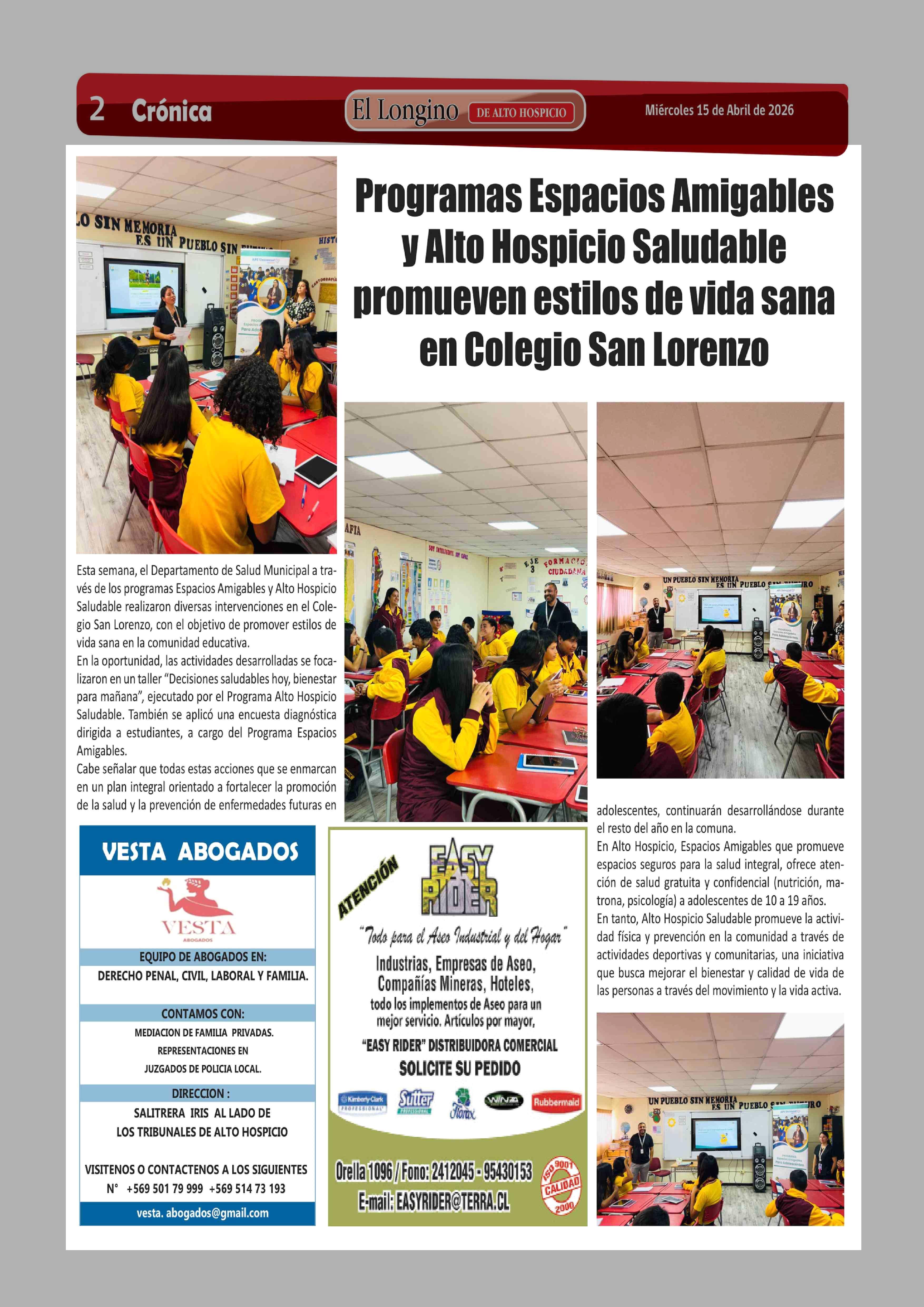 Título: Programas Espacios Amigables y Alto Hospicio Saludable promueven estilos de vida sana en Colegio San Lorenzo