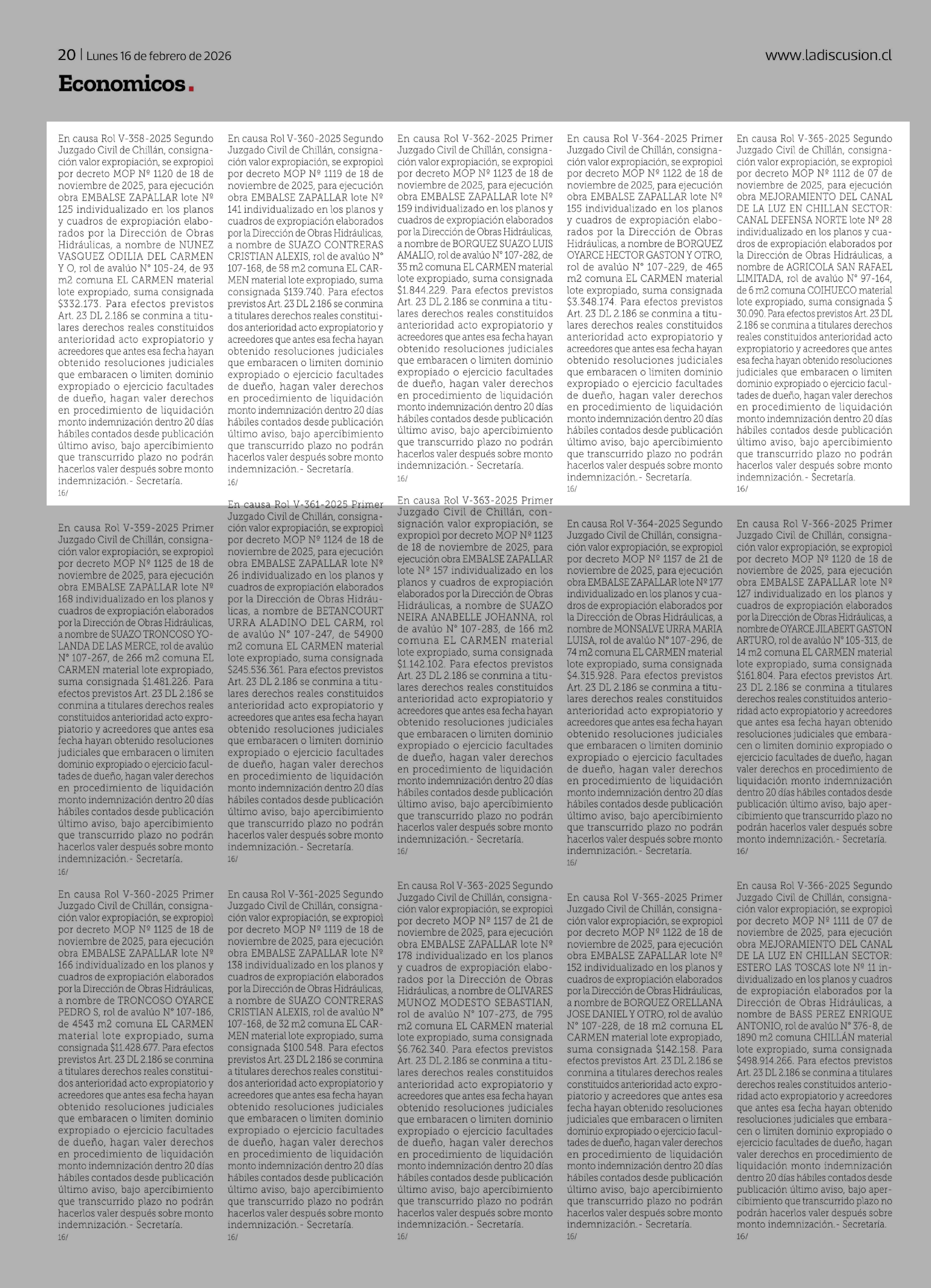 Título: En causa Rol V-358-2025 Segundo Juzgado Civil de Chillán, consignación valor expropiación, se expropioì por decreto MOP Nº 1120 de 18 de noviembre de 2025, para ejecución obra EMBALSE ZAPALLAR lote Nº 125 individualizado en los planos y cuadros de expropiación elaborados por la Dirección de Obras Hi