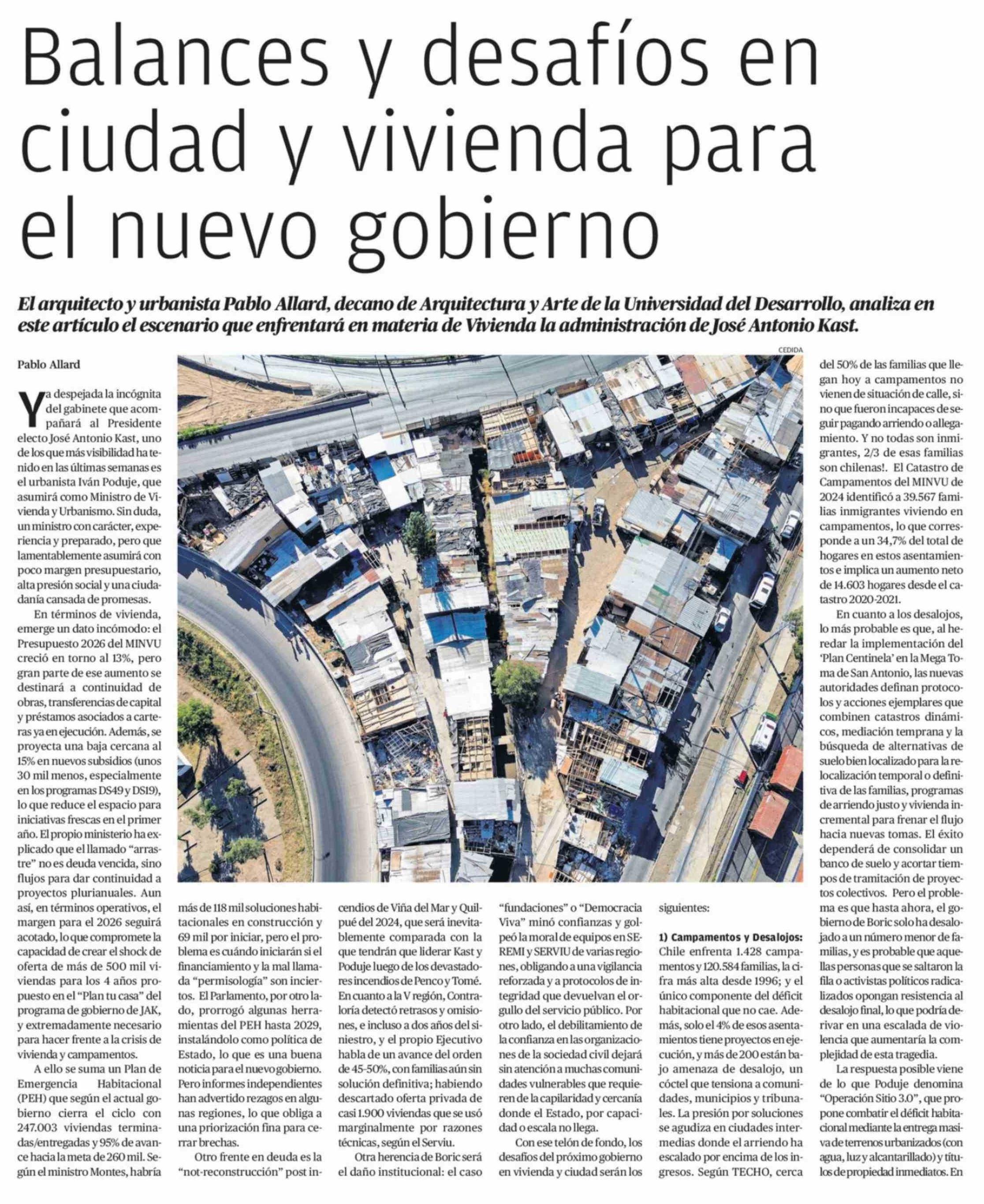 Balances y desafíos en ciudad y vivienda para el nuevo gobierno 01-03-2026 El Mercurio de Antofagasta |