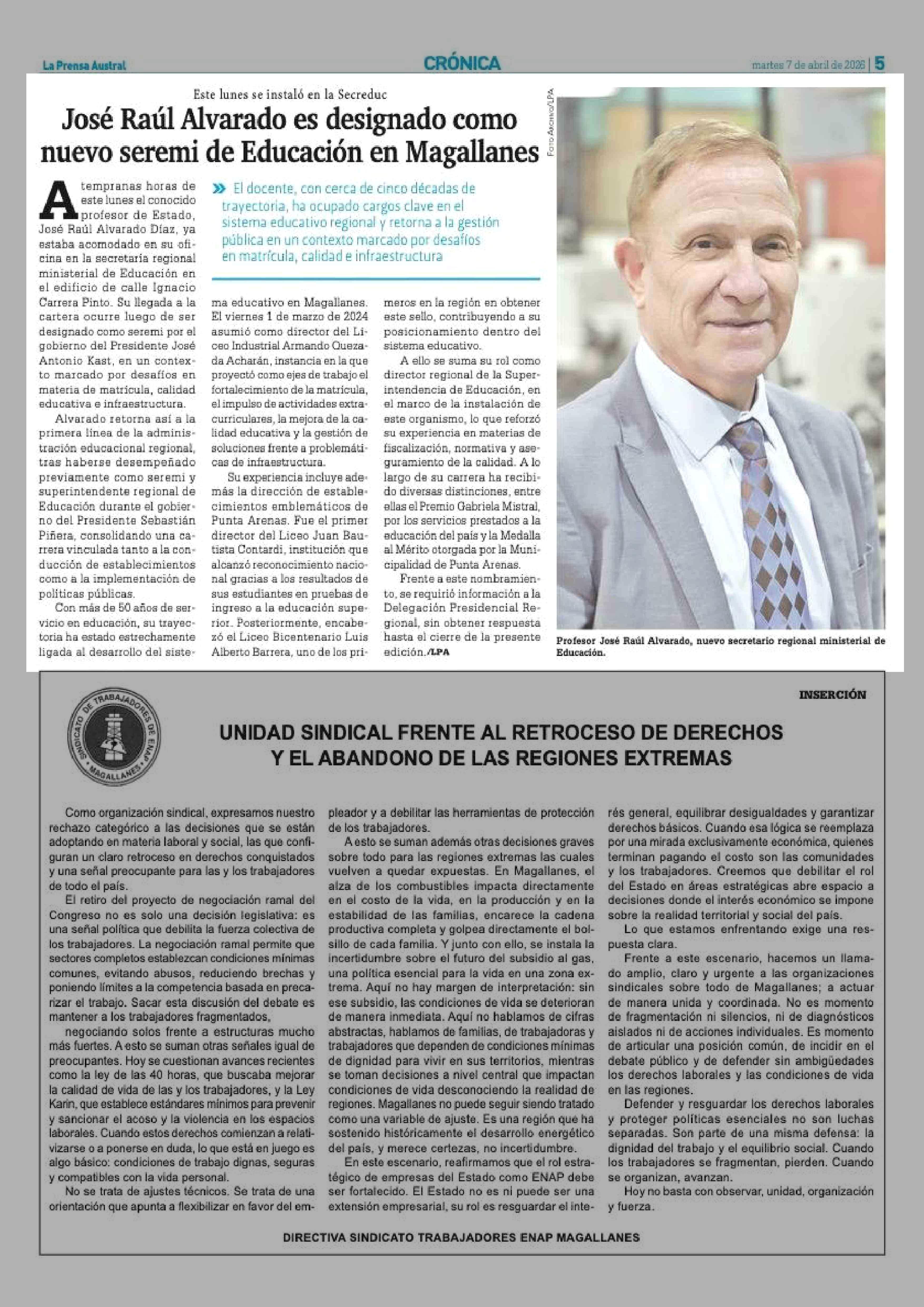 José Raúl Alvarado es designado como nuevo seremi de Educación en Magallanes 07-04-2026 La Prensa Austral |