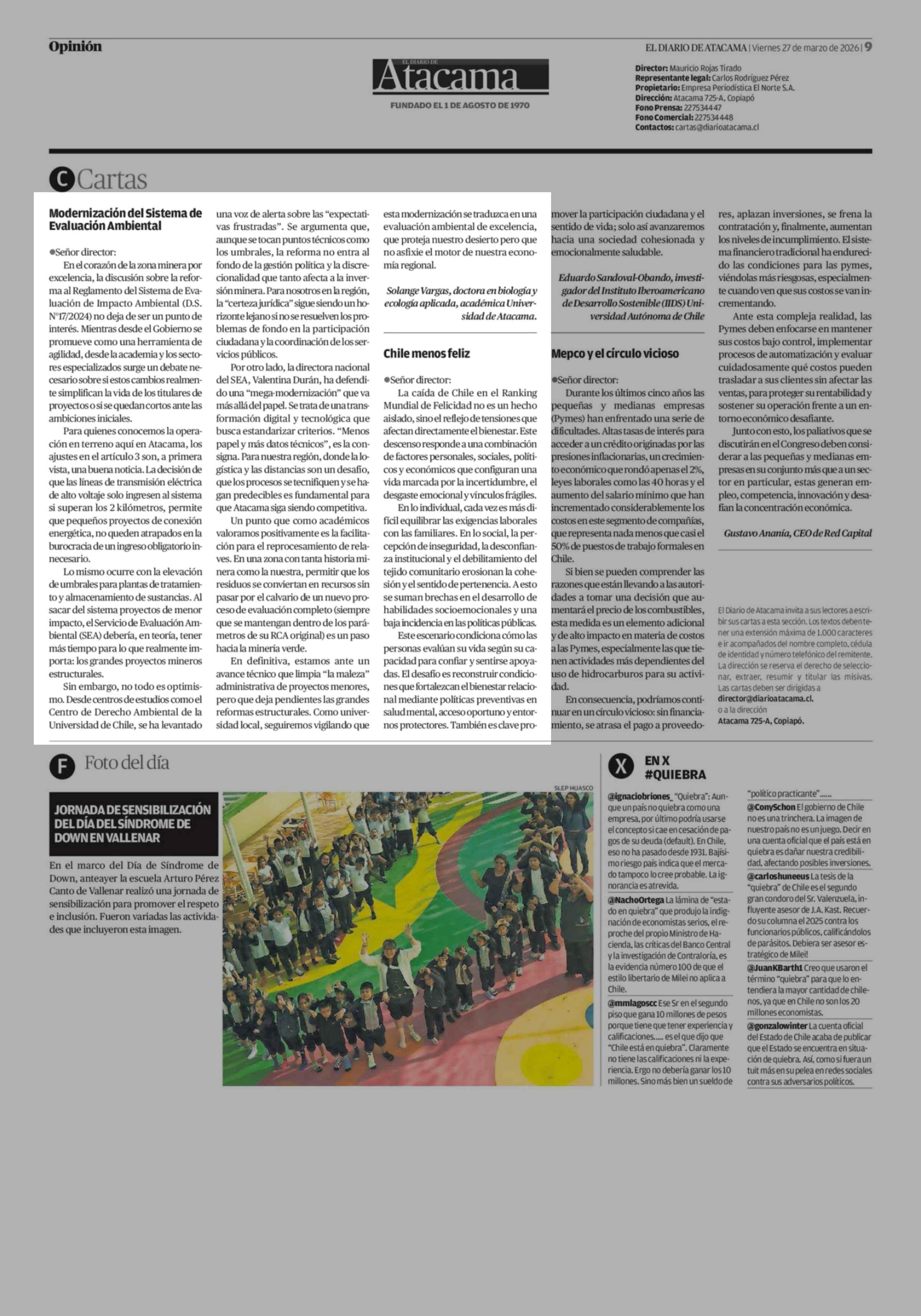 Cartas: Modernización del Sistema de Evaluación Ambiental 27-03-2026 El Diario de Atacama |
