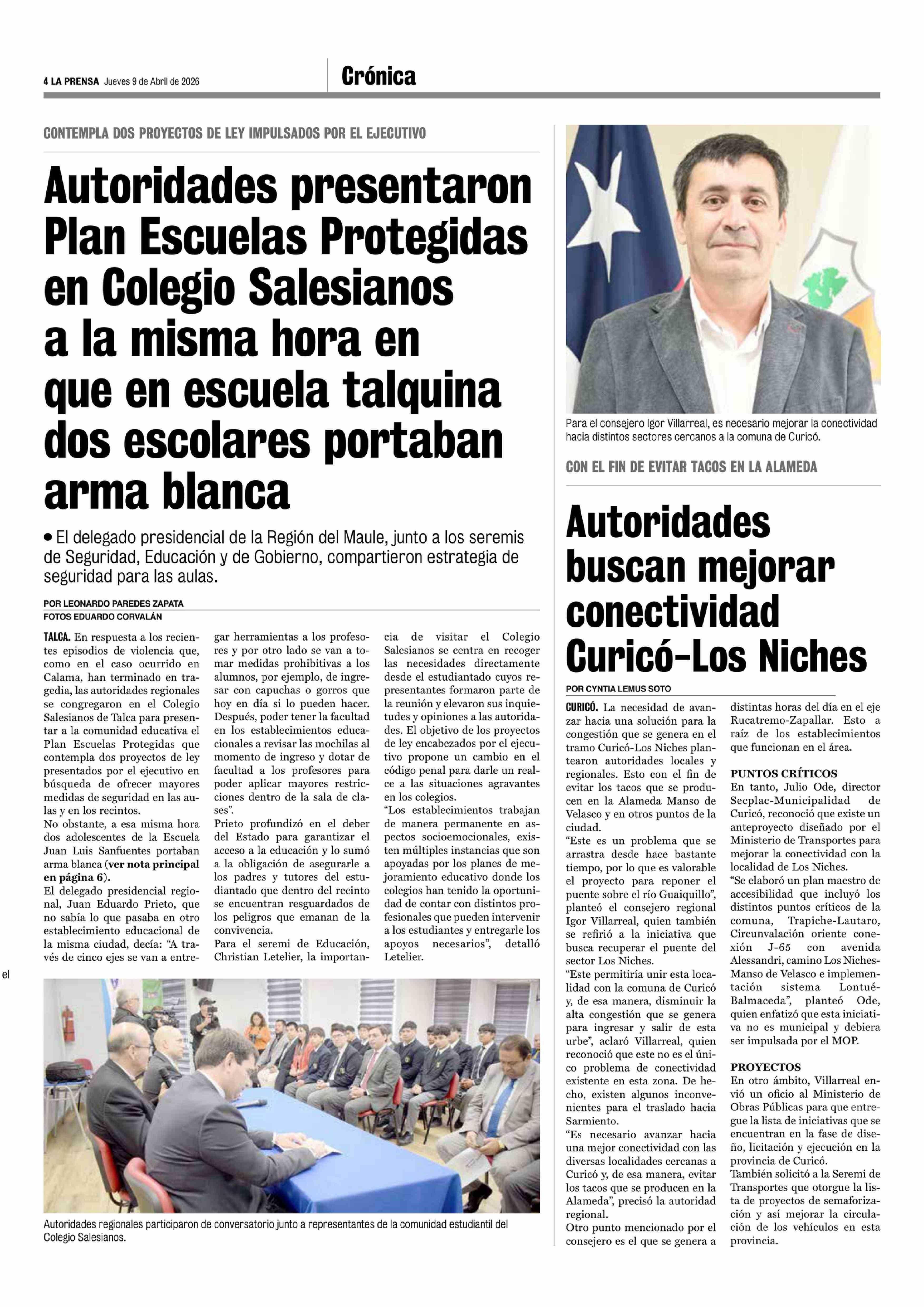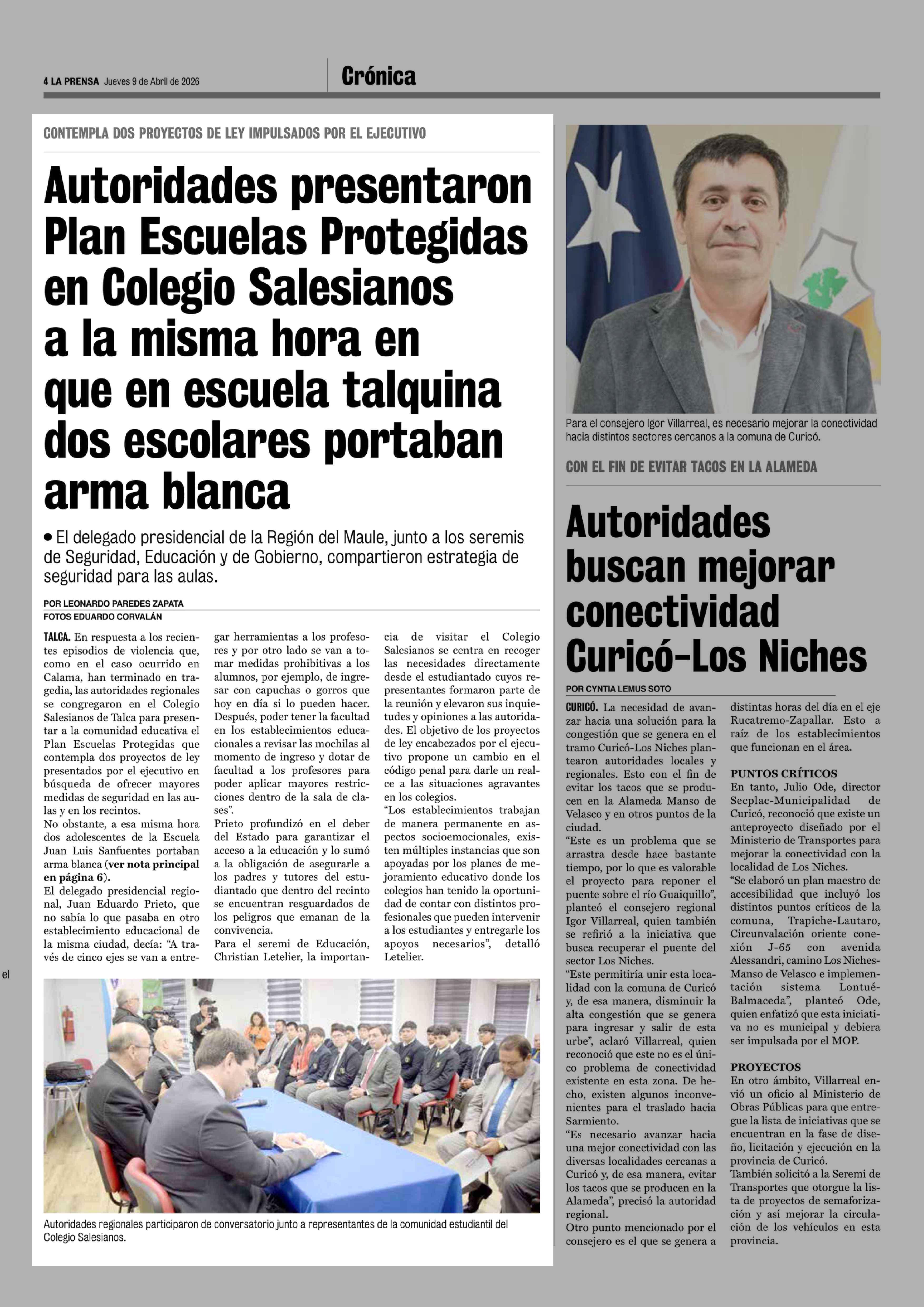 Autoridades presentaron Plan Escuelas Protegidas en Colegio Salesianos a la misma hora en que en escuela talquina dos escolares portaban arma blanca 09-04-2026 La Prensa de Curicó |