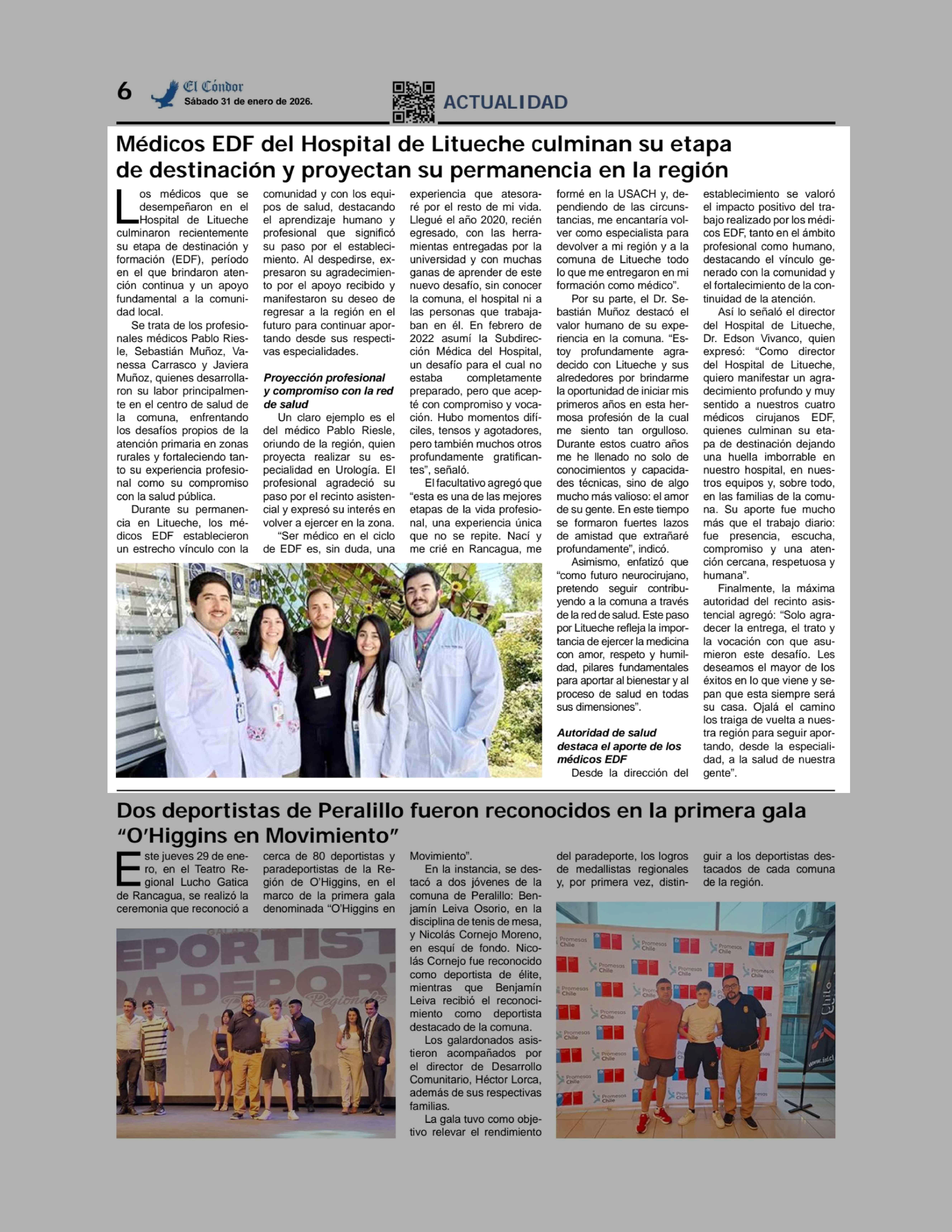 Médicos EDF del Hospital de Litueche culminan su etapa de destinación y proyectan su permanencia en la región 31-01-2026 Diario El Cóndor |