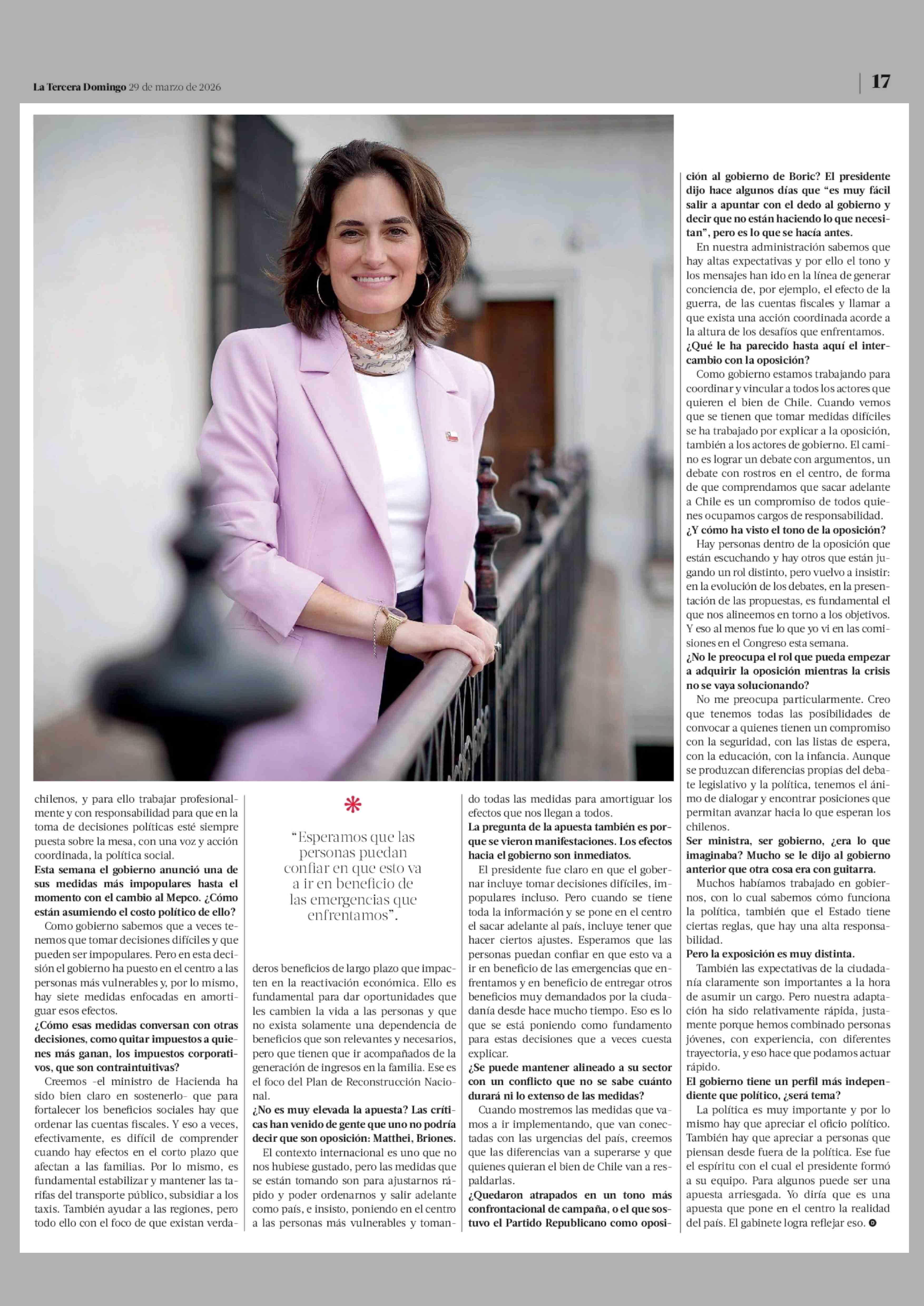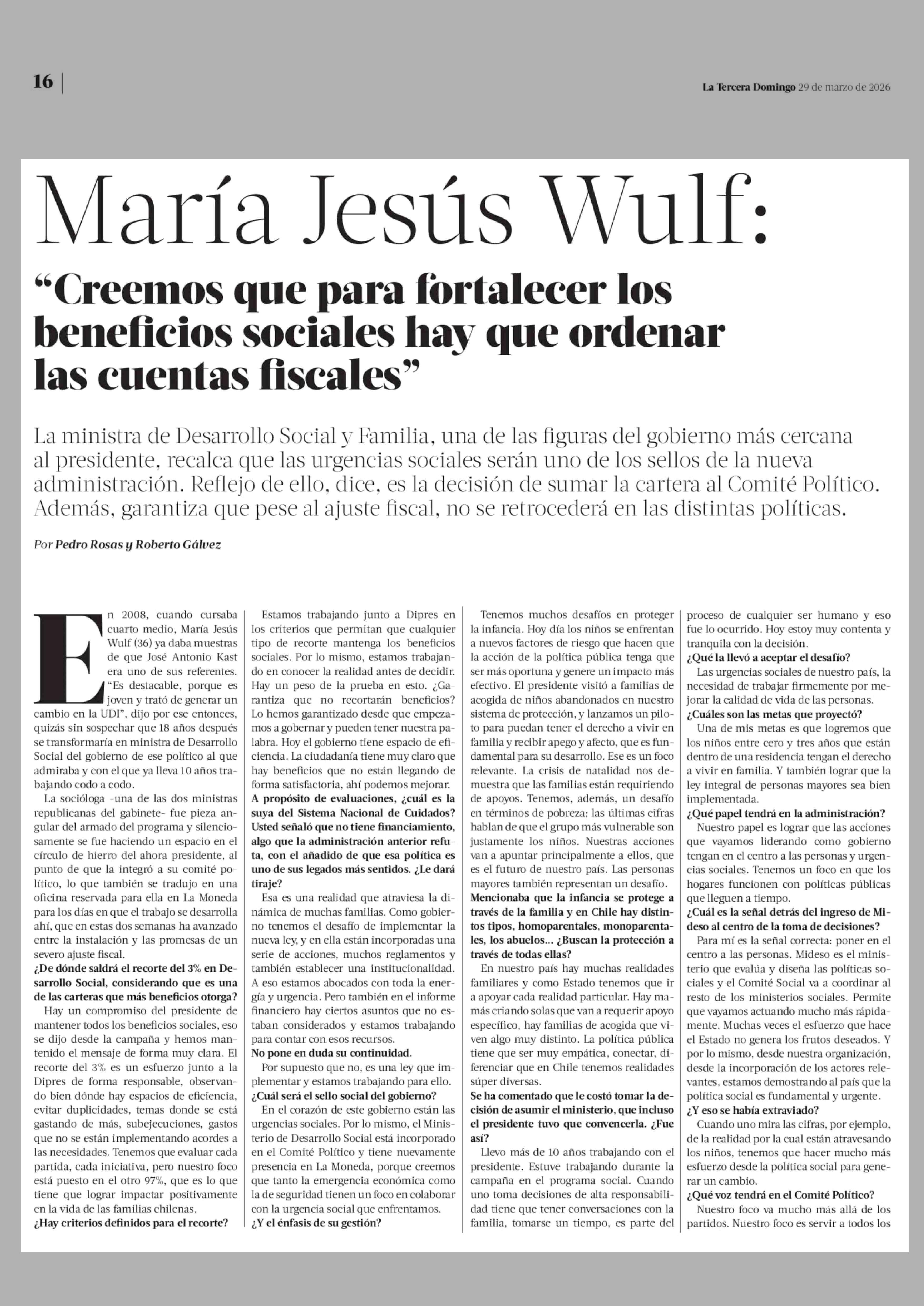 María Jesús Wulf: "Creemos que para fortalecer los beneficios sociales hay que ordenar las cuentas fiscales" 29-03-2026 La Tercera |