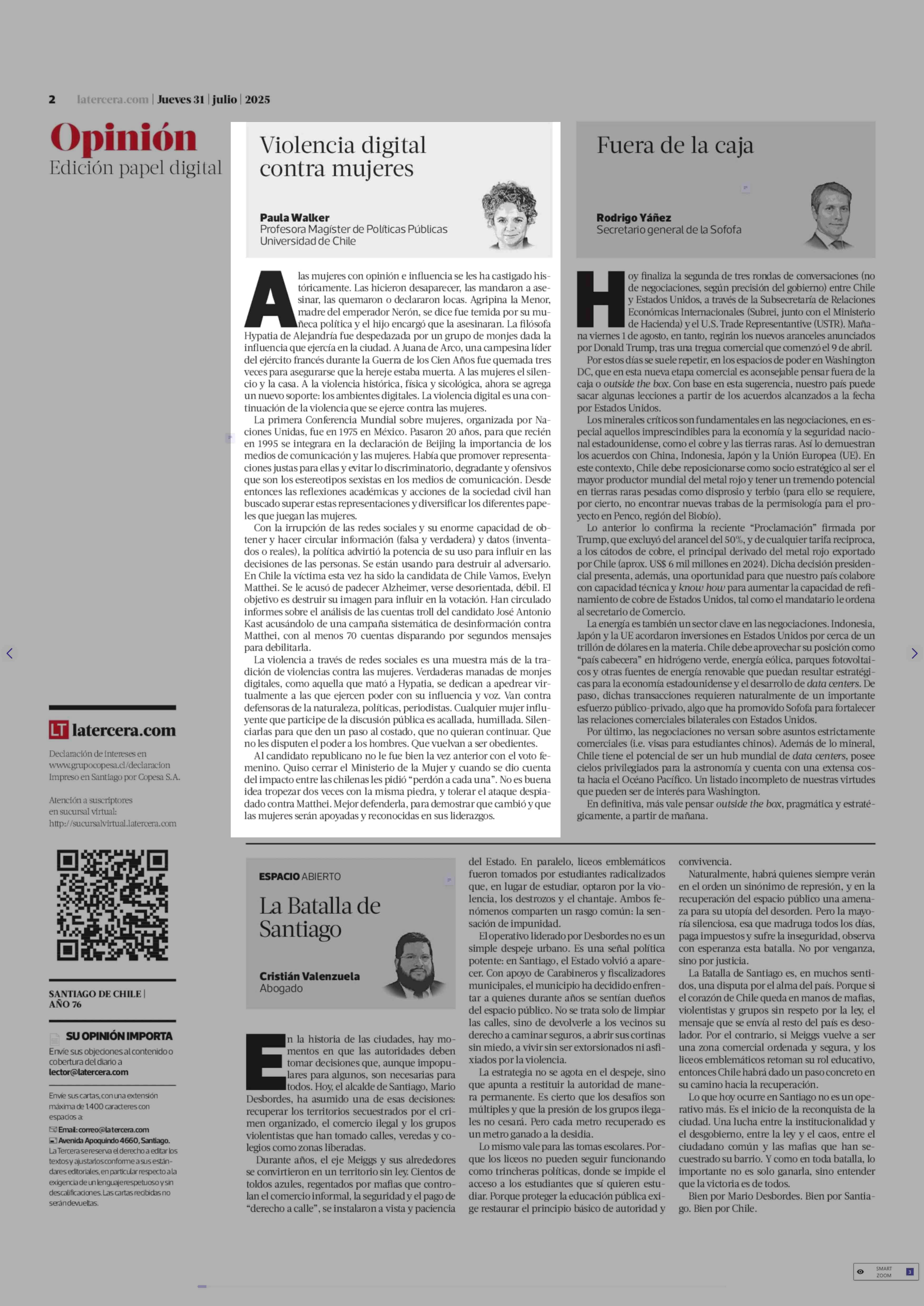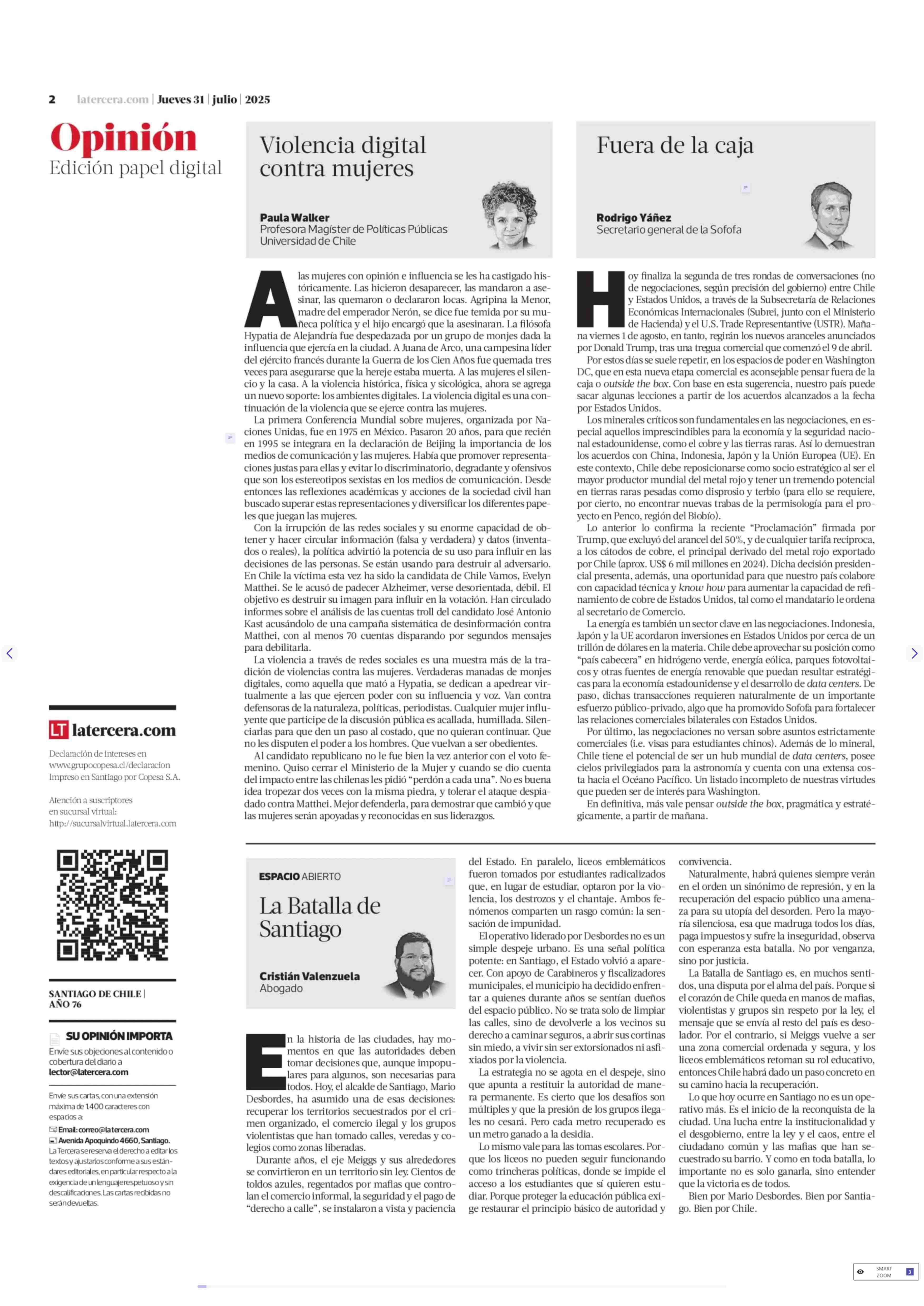 Columnas de Opinión: Violencia digital contra mujeres 31-07-2025 La Tercera |