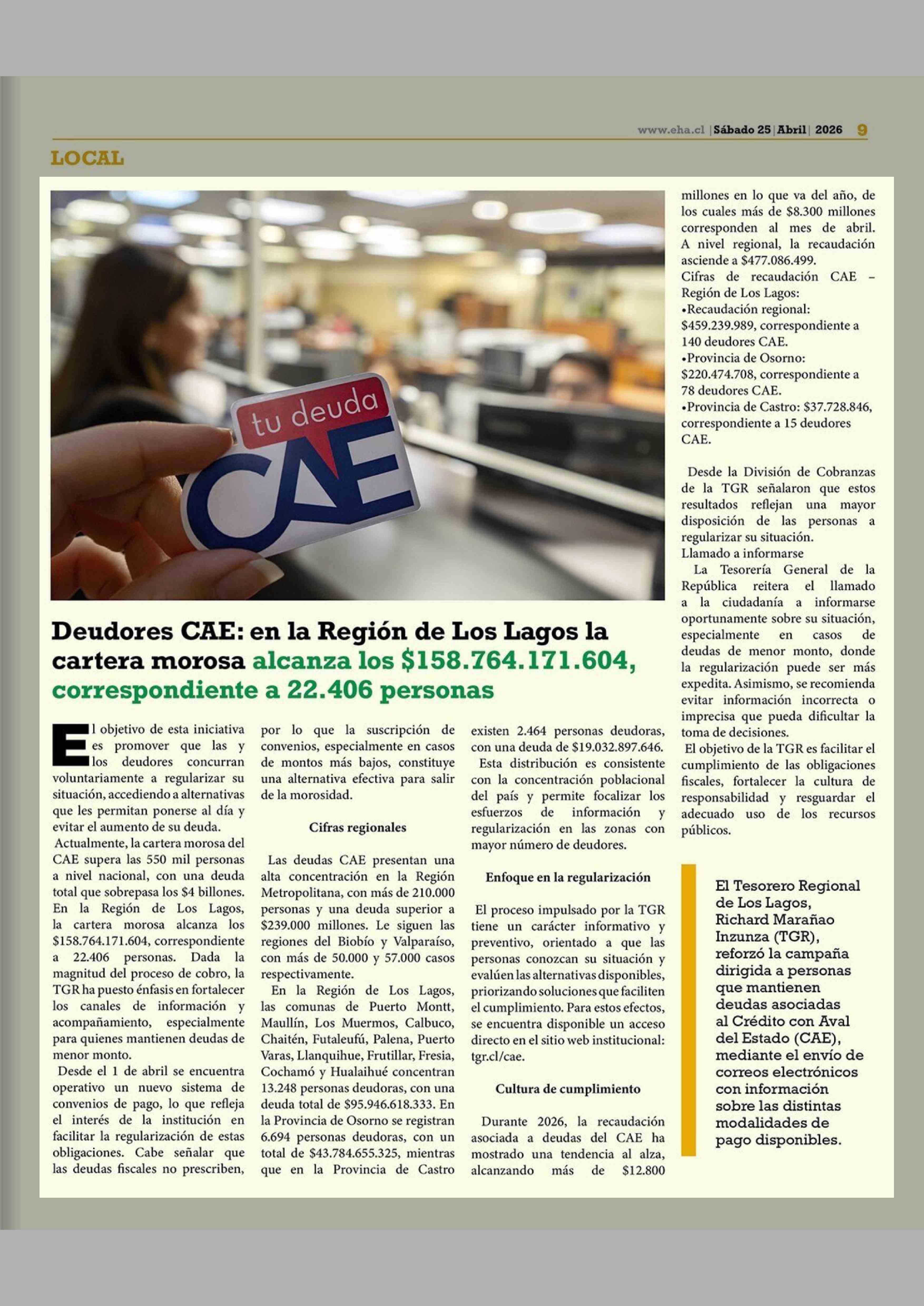 Deudores CAE: en la Region de Los Lagos la cartera morosa alcanza los $158.764.171.604, correspondiente a 22.406 personas 25-04-2026 El Heraldo Austral |