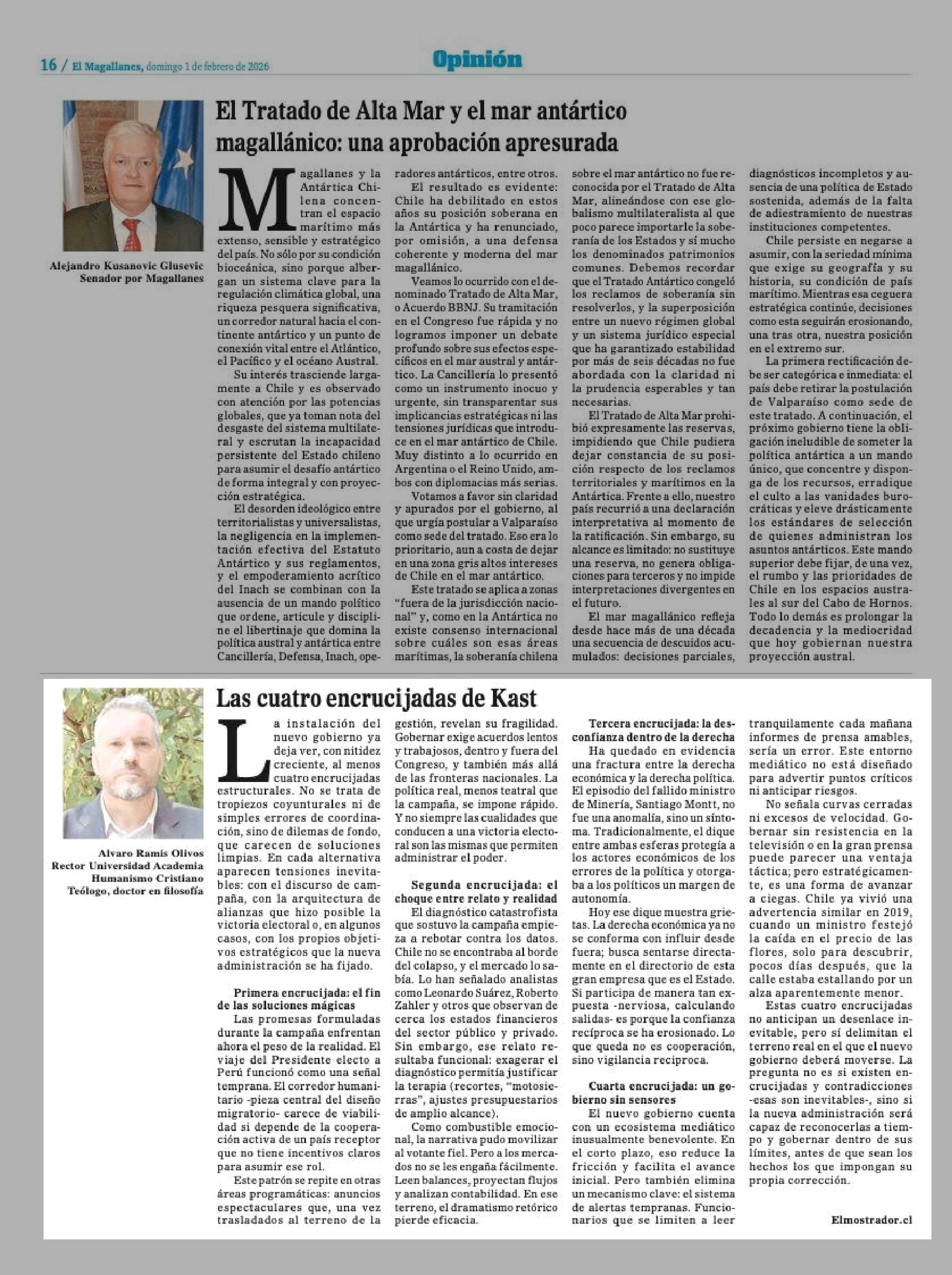 Columnas de Opinión: Las cuatro encrucijadas de Kast 01-02-2026 El Magallanes |