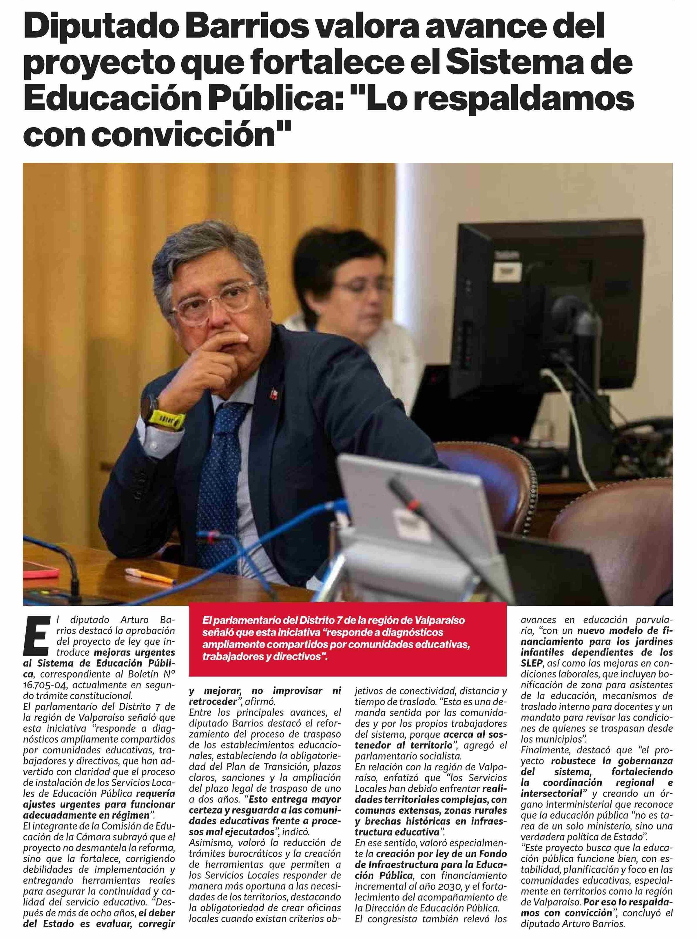 Título: Diputado Barrios valora avance del proyecto que fortalece el Sistema de Educación Pública: "Lo respaldamos con convicción”