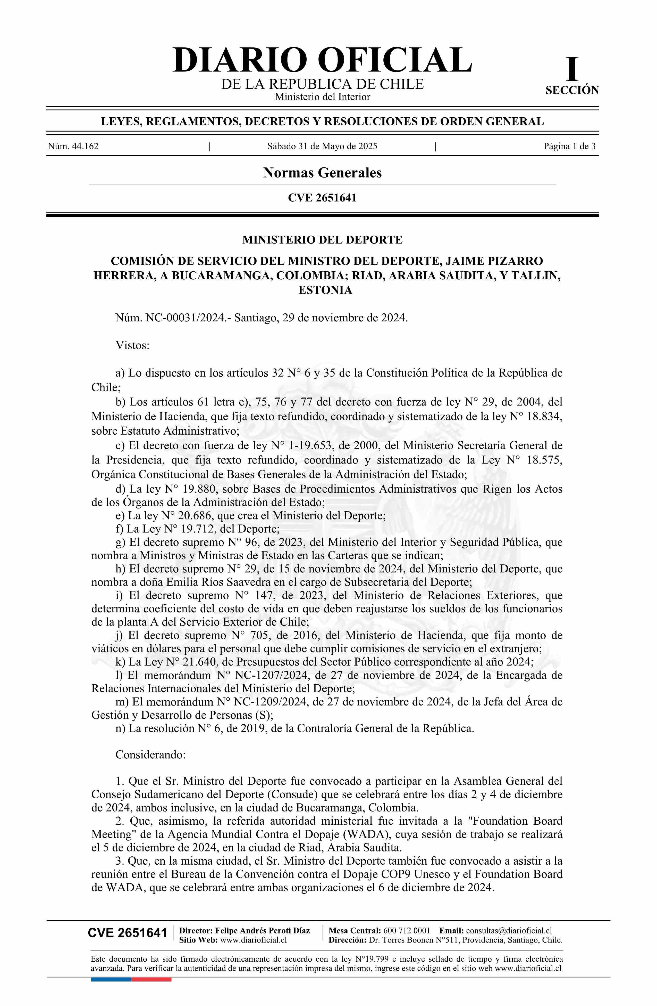 | Título: | Decreto número NC-31/2024, de 2024.- Designa a don Jaime Pizarro Herrera, Ministro del Deporte, en comisión de servicio a Bucaramanga, Colombia; Riad, Arabia Saudita, y Tallin, Estonia |