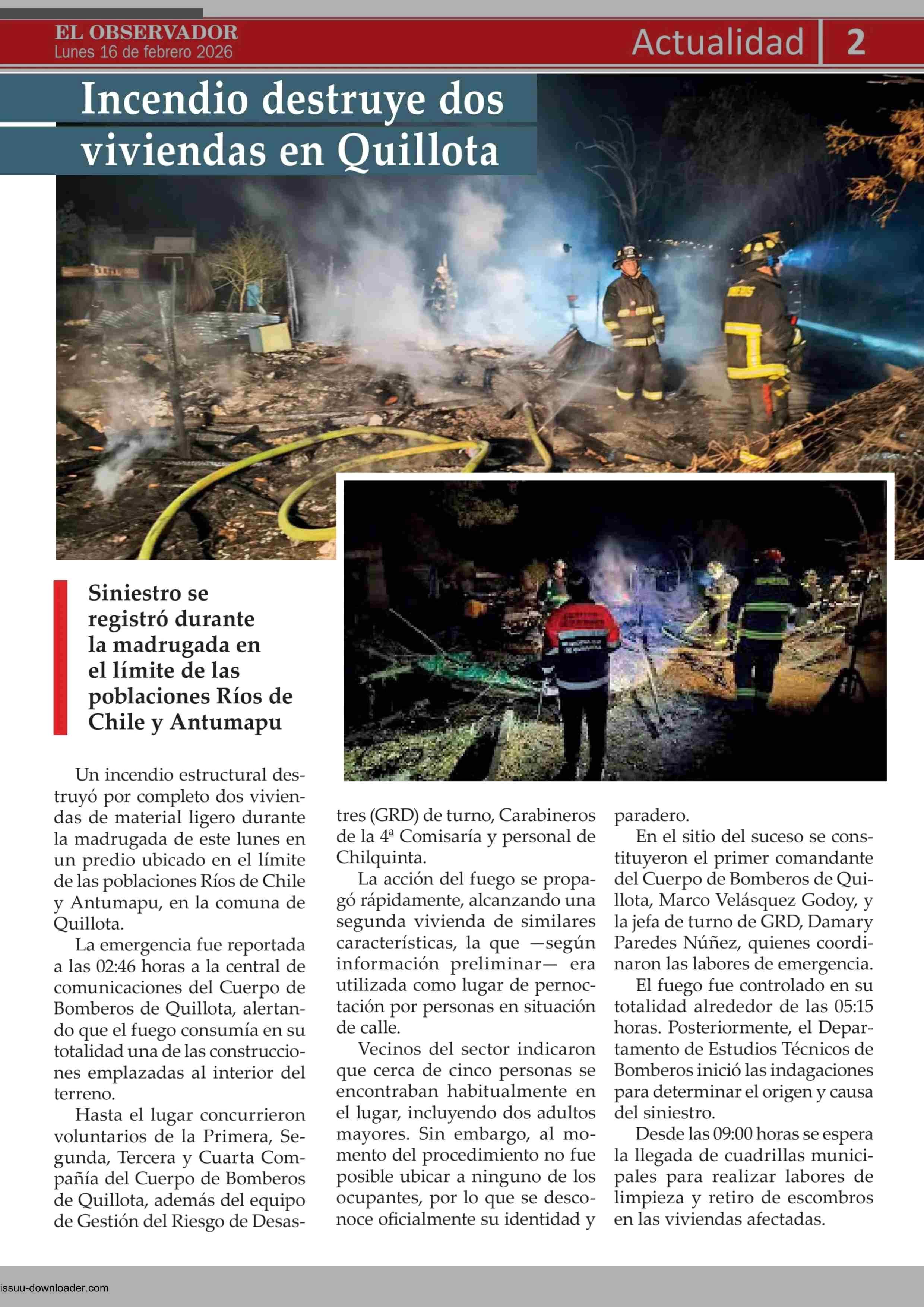Incendio destruye dos viviendas en Quillota 16-02-2026 El Observador Vespertino |