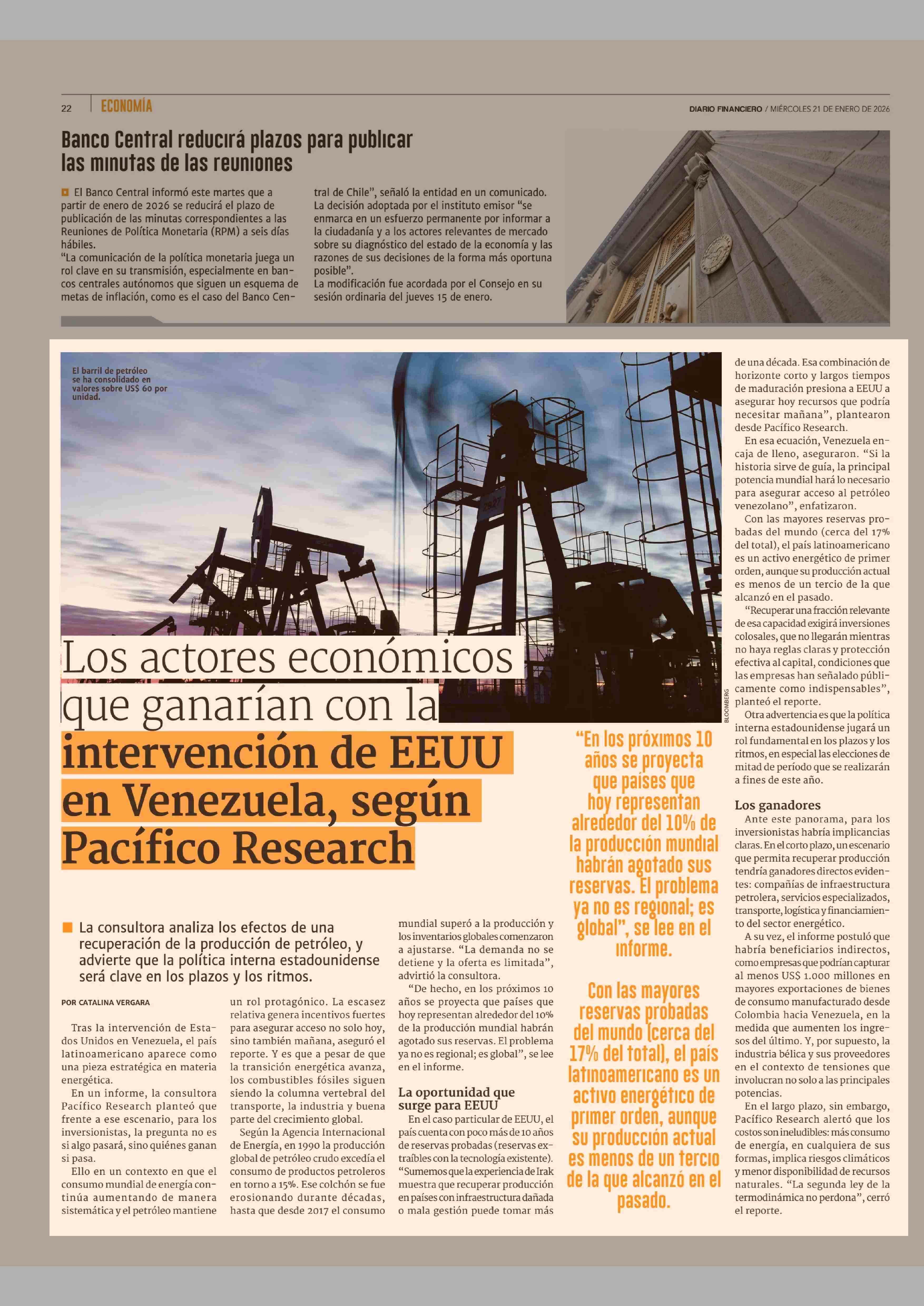 Los actores económicos que ganarían con la intervención de EEUU en Venezuela, según Pacífico Research 21-01-2026 Diario Financiero |