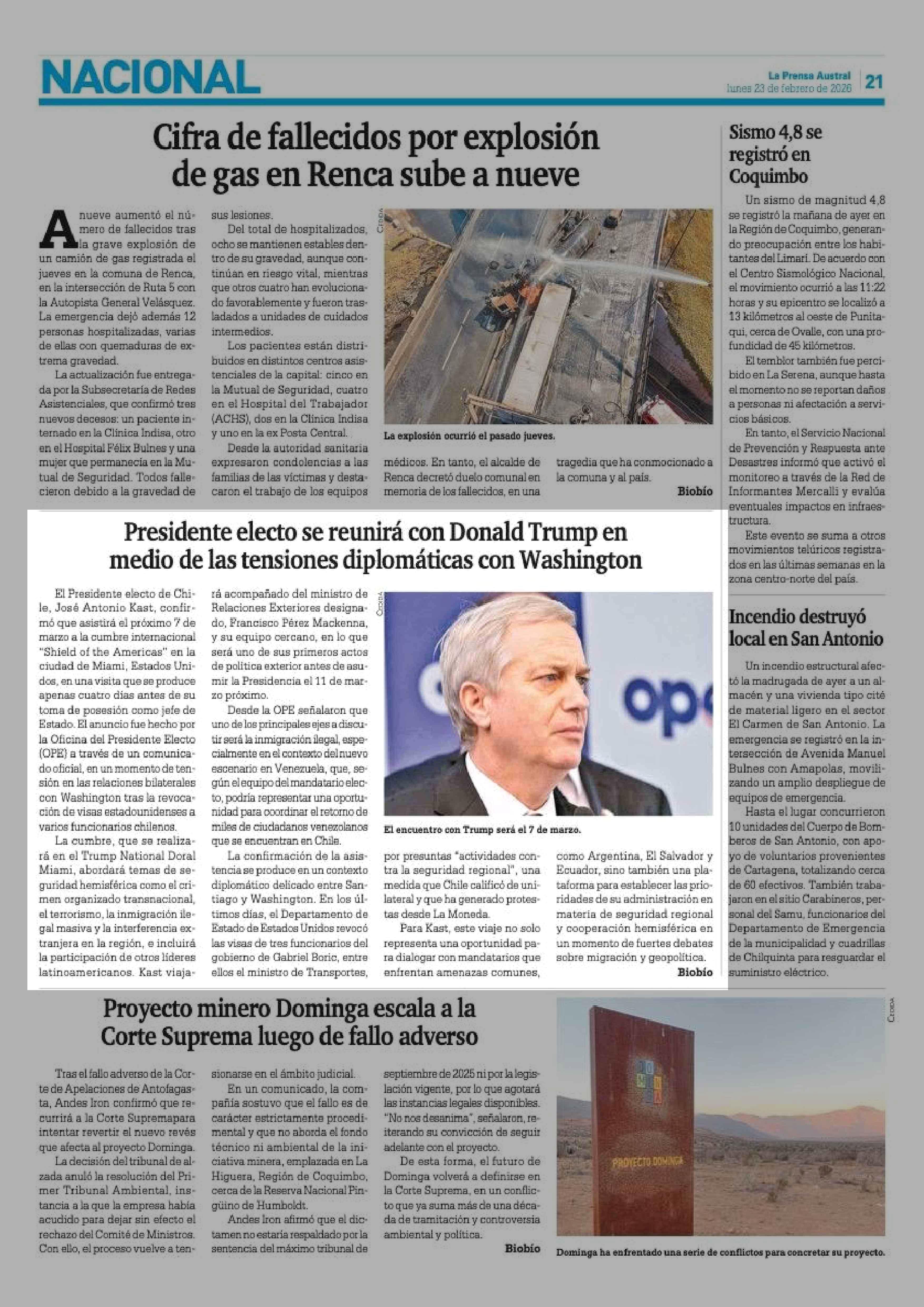 Presidente electo se reunirá con Donald Trump en medio de las tensiones diplomáticas con Washington 23-02-2026 La Prensa Austral |