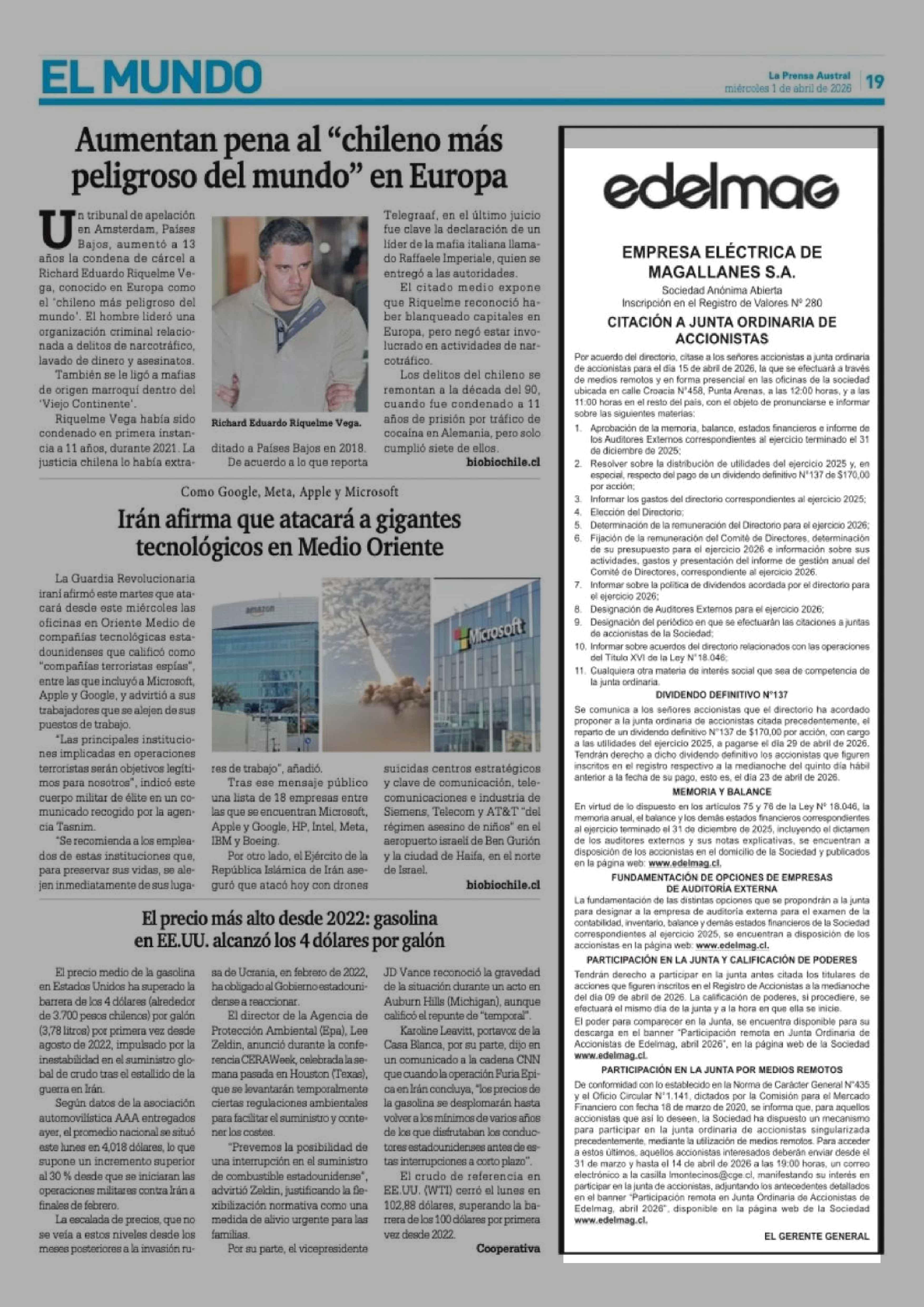 Fecha: 01-04-2026 Sector: Noticia general Región: Región de Magallanes y de la Antártica Chilena