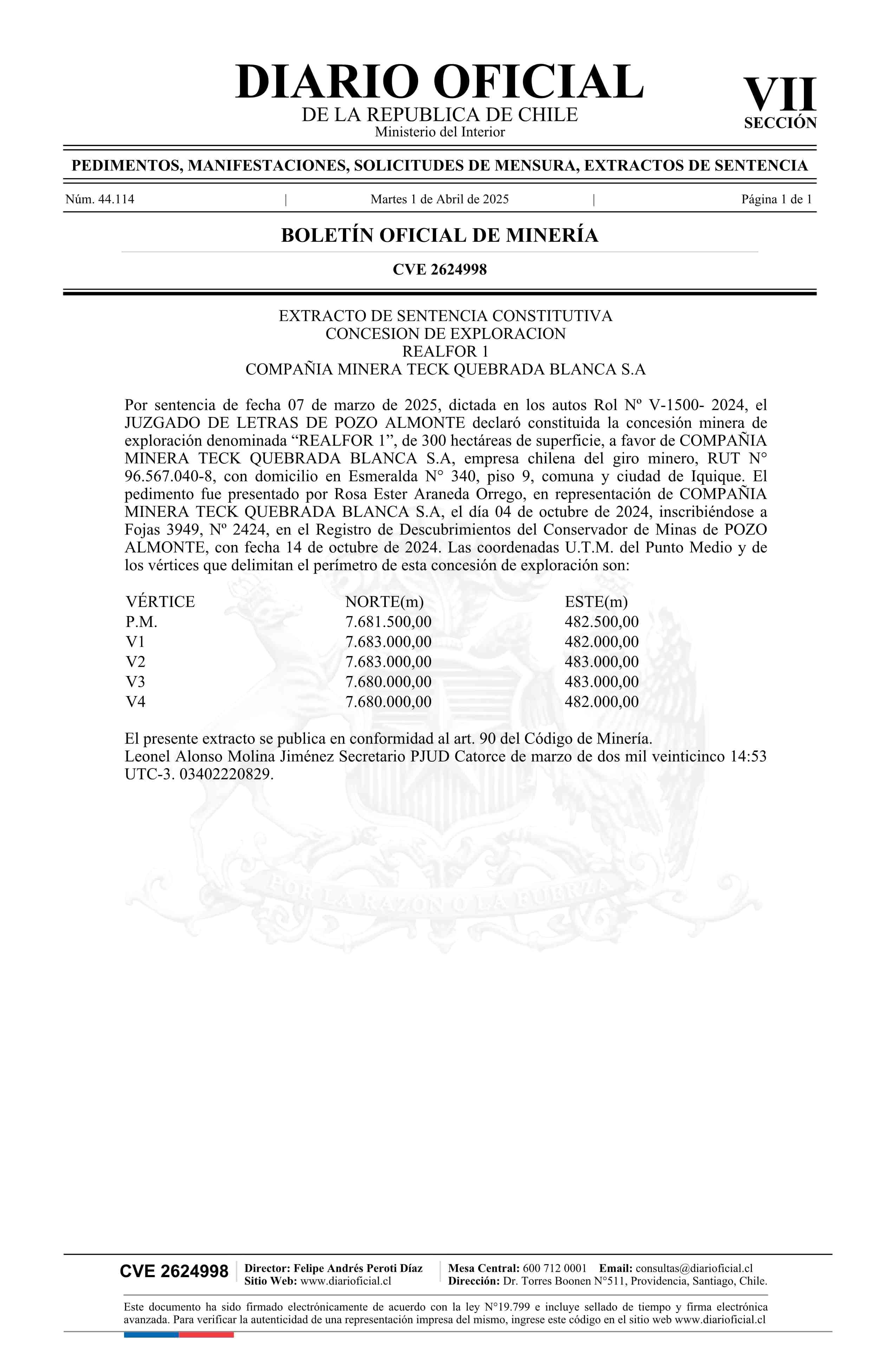 REALFOR 1 / Compañía Minera Teck Quebrada Blanca S.A. 01-04-2025 DIARIO OFICIAL CHILE - BOLETÍN OFICIAL DE MINERÍA |