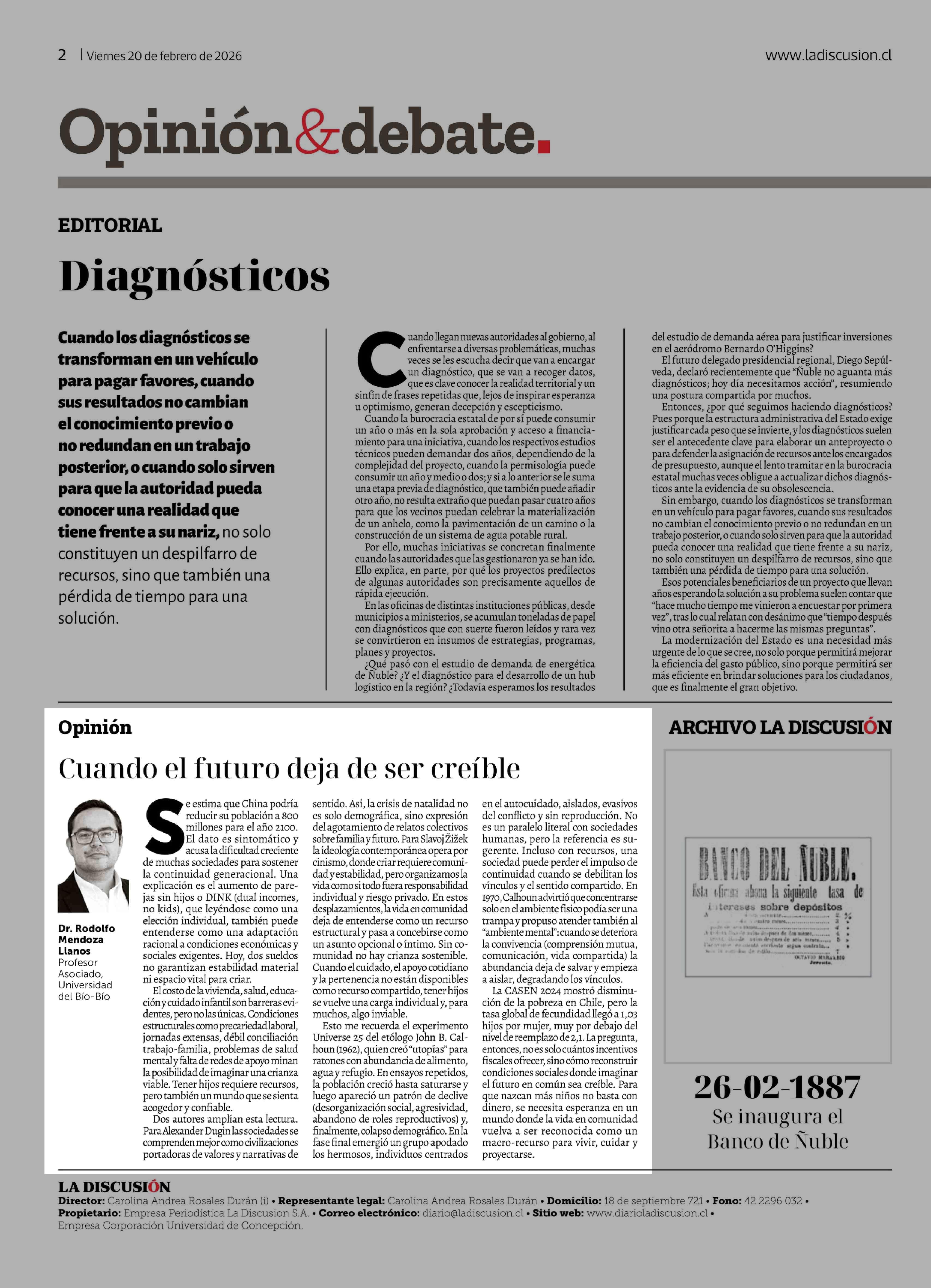 Fecha: 20-02-2026 Sector: Columnas de Opinión Región: Región del Ñuble