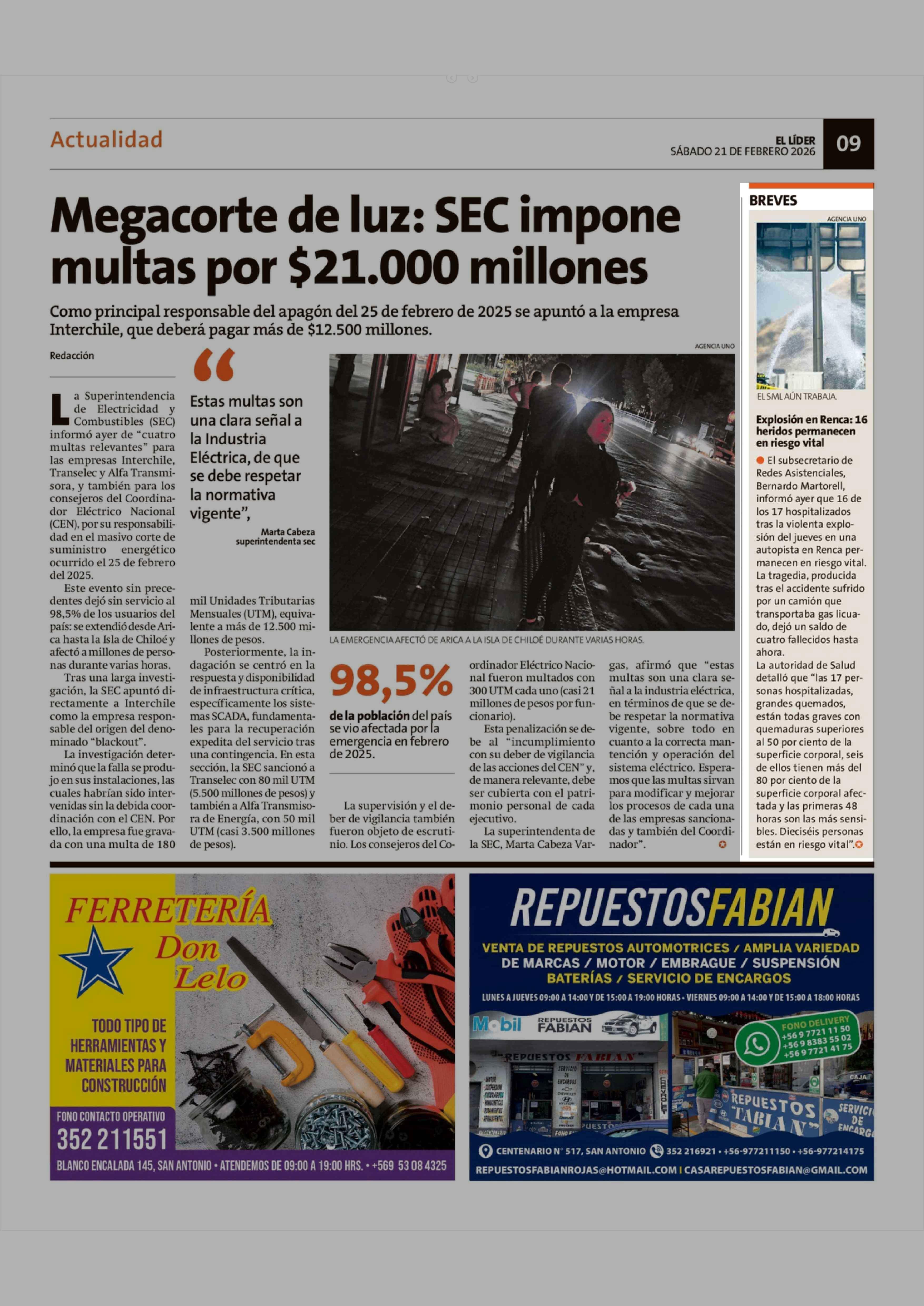 Explosión en Renca: 16 heridos permanecen en riesgo vital 21-02-2026 El Líder |