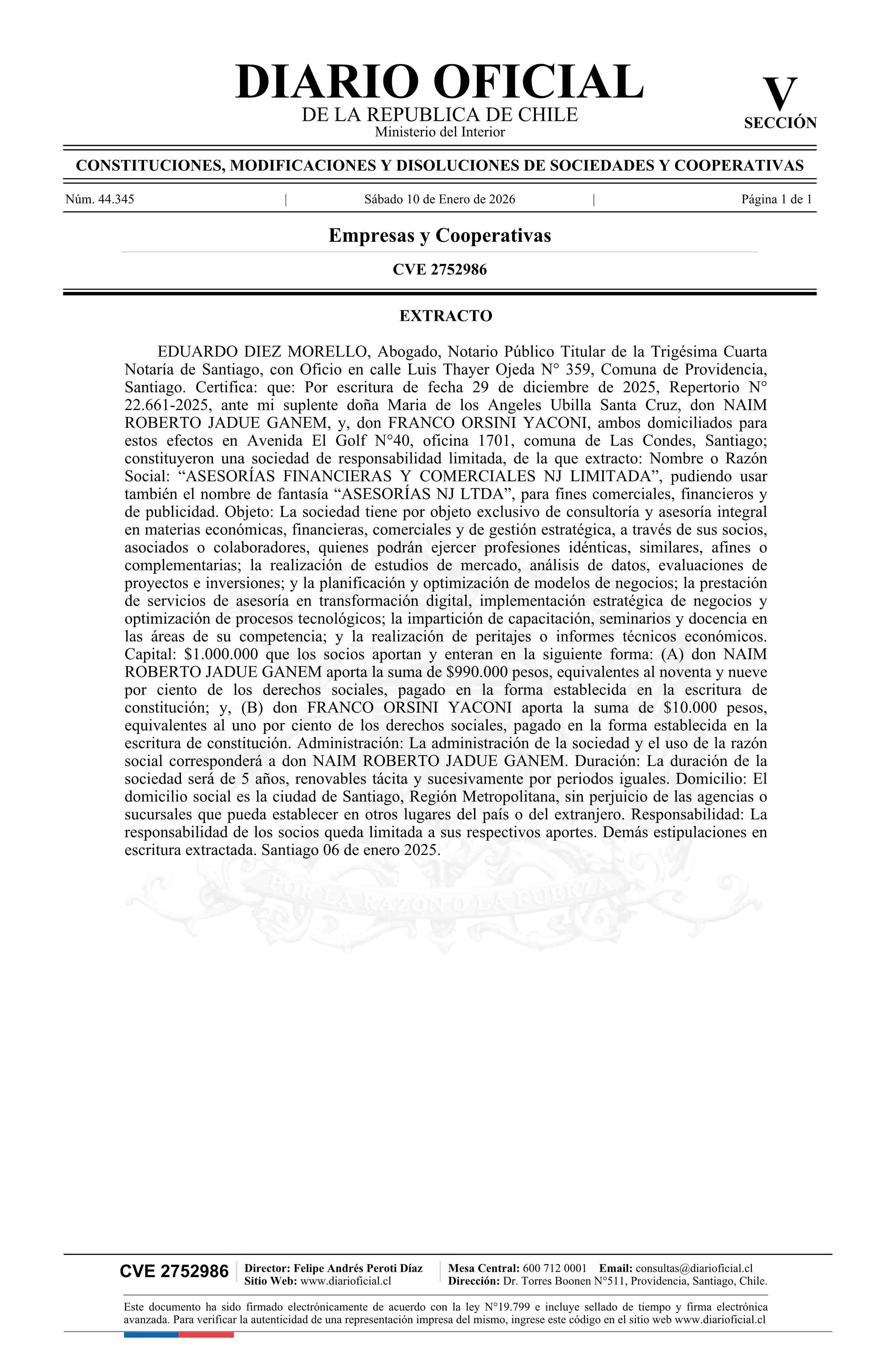 Título: ASESORÍAS FINANCIERAS Y COMERCIALES NJ LIMITADA