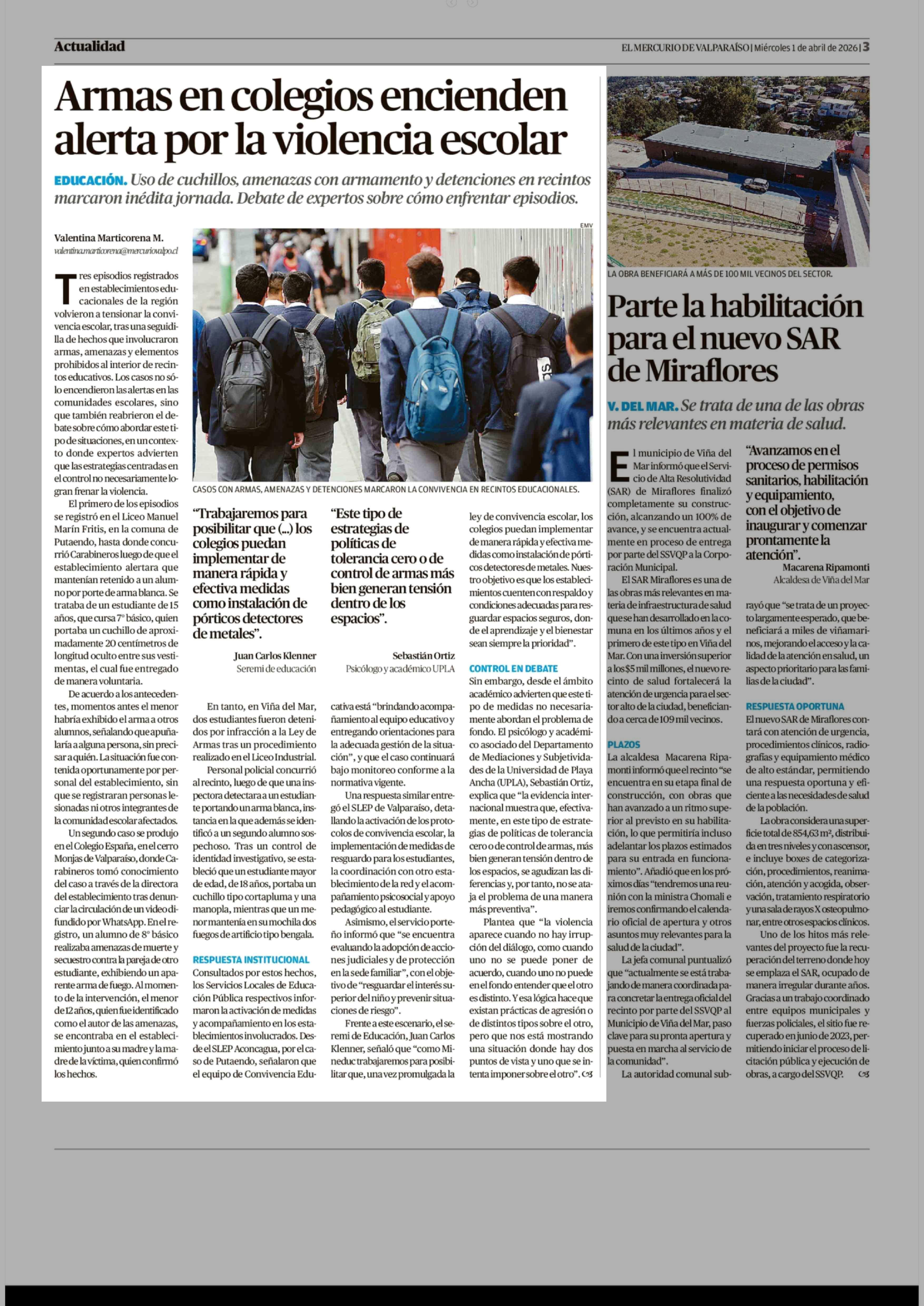 Armas en colegios encienden alerta por la violencia escolar 01-04-2026 El Mercurio de Valparaíso |